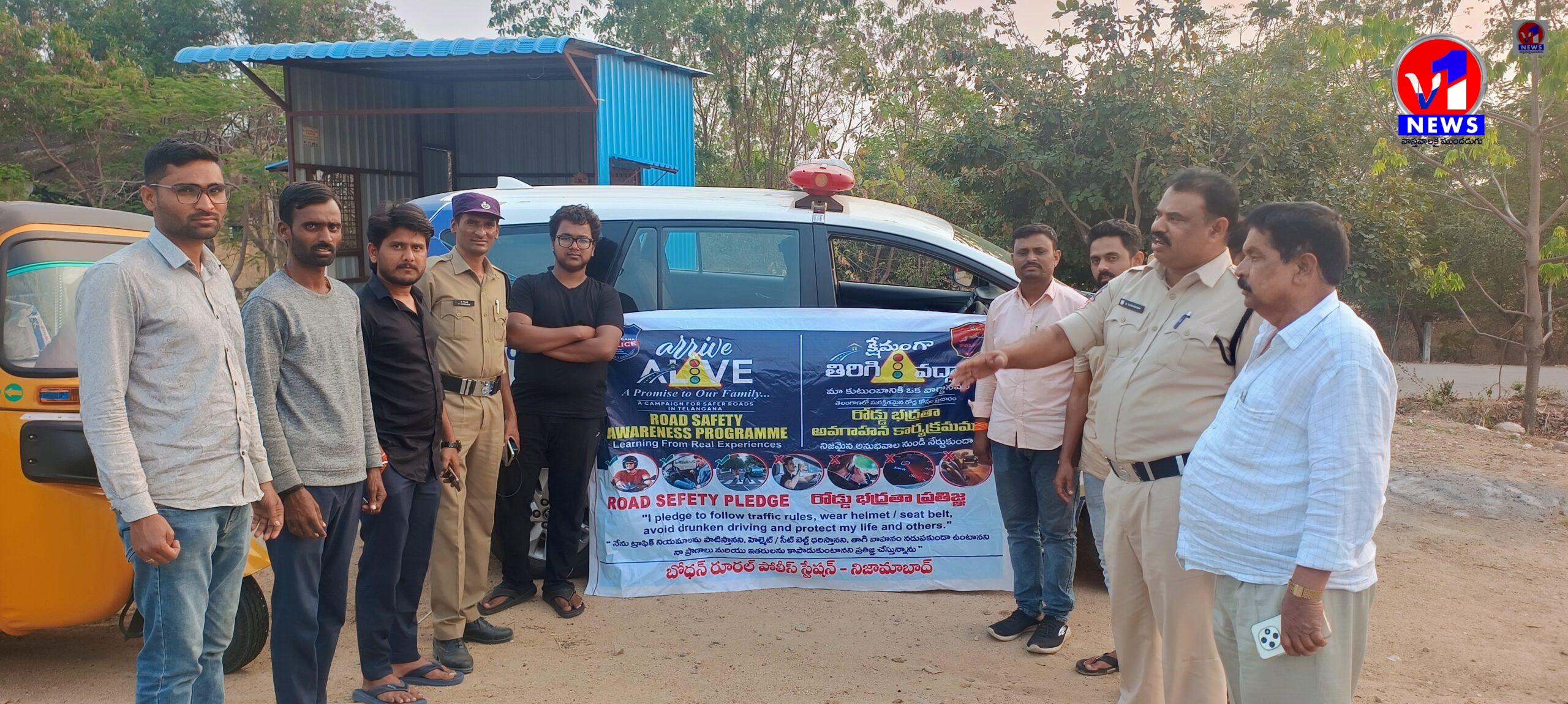 . : ప్రయాణికులకు అవగాహన కల్పిస్తున్న పోలీసులు. సాలూర : రోడ్డు భద్రత నియమాలను ప్రతి ఒక్కరు బాధ్యతగా పాటించాలని బోధన్ రూరల్ పోలీసులు పేర్కొన్నారు.అరైవ్ అలైవ్ కార్యక్రమంలో భాగంగా శుక్రవారం సాలూర మండల కేంద్రం శివారులోని అంతర్రాష్ట్ర చెక్ పోస్ట్ ప్రాంతంలో బోధన్ రూరల్ పోలీసుల ఆధ్వర్యంలో రోడ్డు భద్రత నియమ నిబంధనల అవగాహన కార్యక్రమాన్ని నిర్వహించారు.ద్విచక్ర వాహనాలపై ప్రయాణించే ప్రయాణికులు తప్పనిసరిగా హెల్మెట్ ను ధరించి వాహనానికి