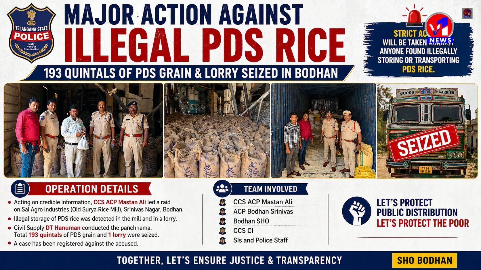బోధన్లో అక్రమ PDS బియ్యం నిల్వలపై దాడి – 193 క్వింటాళ్ల ధాన్యం, లారీ స్వాధీనం