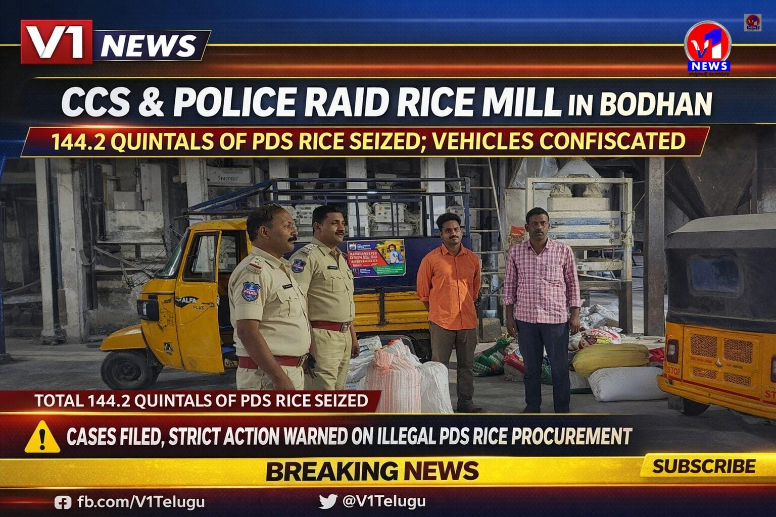 బోధన్లో రైస్ మిల్లుపై సీసీఎస్–పోలీసుల దాడి 144.2 క్వింటాళ్ల PDS ధాన్యం స్వాధీనం – వాహనాలు సీజ్