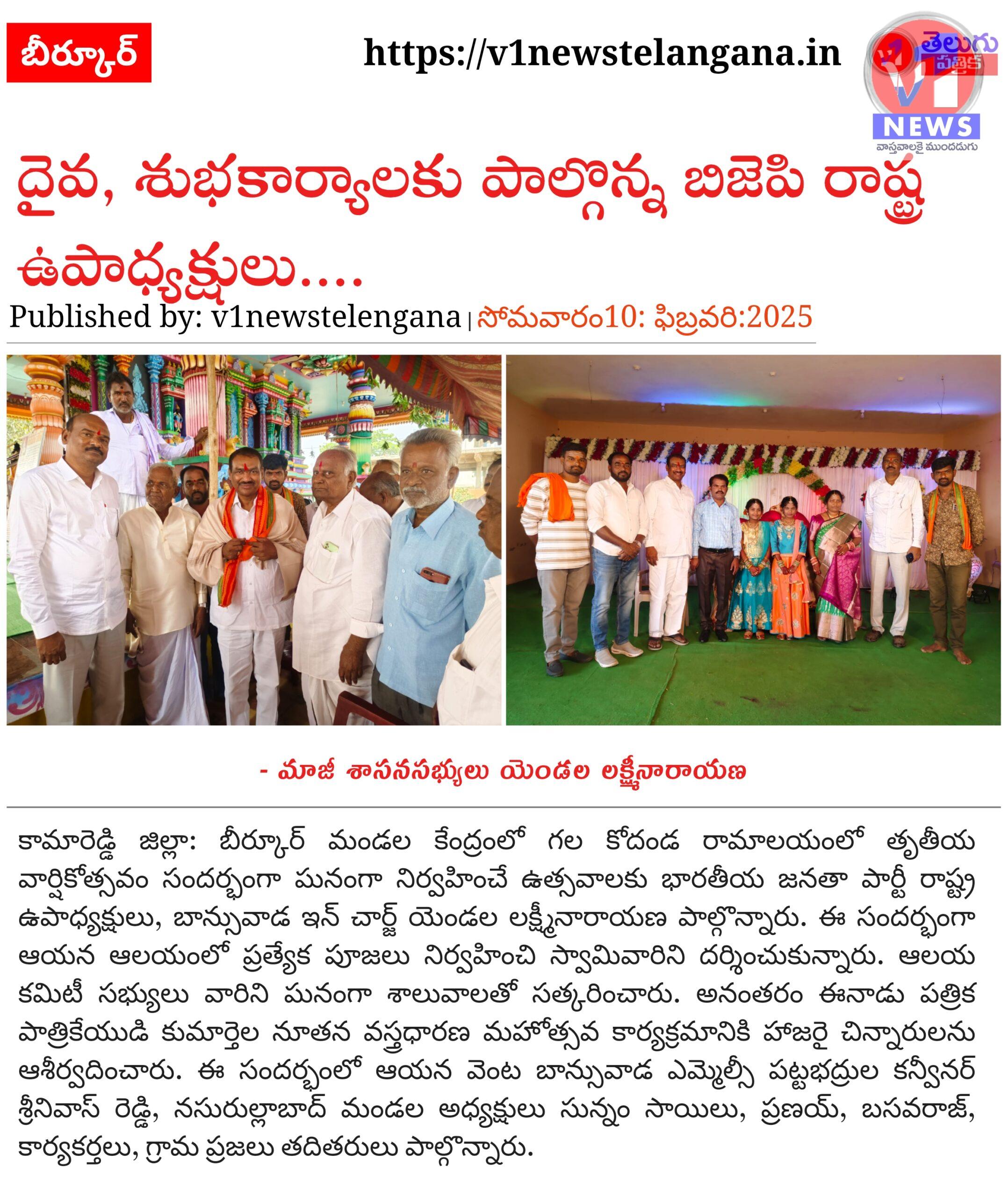కామారెడ్డి జిల్లా: బీర్కూర్ మండల కేంద్రంలో గల కోదండ రామాలయంలో తృతీయ వార్షికోత్సవం సందర్భంగా ఘనంగా నిర్వహించే ఉత్సవాలకు భారతీయ జనతా పార్టీ రాష్ట్ర ఉపాధ్యక్షులు, బాన్సువాడ ఇన్ చార్జ్ యెండల లక్ష్మీనారాయణ పాల్గొన్నారు. ఈ సందర్భంగా ఆయన ఆలయంలో ప్రత్యేక పూజలు నిర్వహించి స్వామివారిని దర్శించుకున్నారు. ఆలయ కమిటీ సభ్యులు వారిని ఘనంగా శాలువాలతో సత్కరించారు. అనంతరం ఈనాడు పత్రిక పాత్రికేయుడి కుమార్తెల నూతన వస్త్రధారణ మహోత్సవ కార్యక్రమానికి హాజరై చిన్నారులను ఆశీర్వదించారు.
