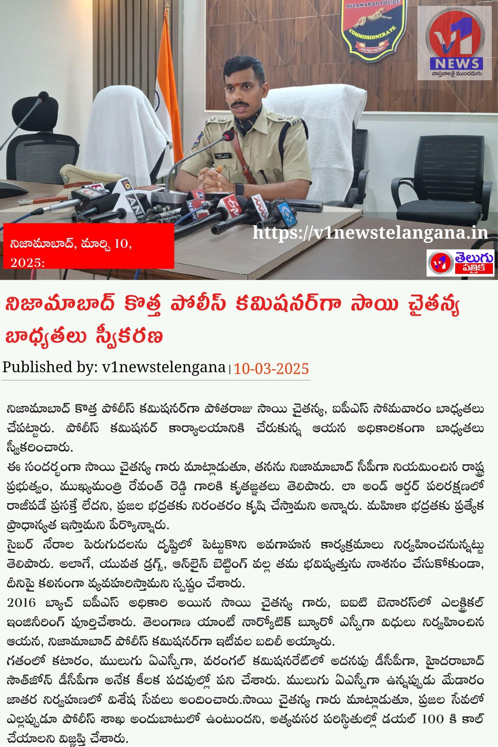 నిజామాబాద్ కొత్త పోలీస్ కమిషనర్గా పోతరాజు సాయి చైతన్య, ఐపీఎస్ సోమవారం బాధ్యతలు చేపట్టారు. పోలీస్ కమిషనర్ కార్యాలయానికి చేరుకున్న ఆయన అధికారికంగా బాధ్యతలు స్వీకరించారు.