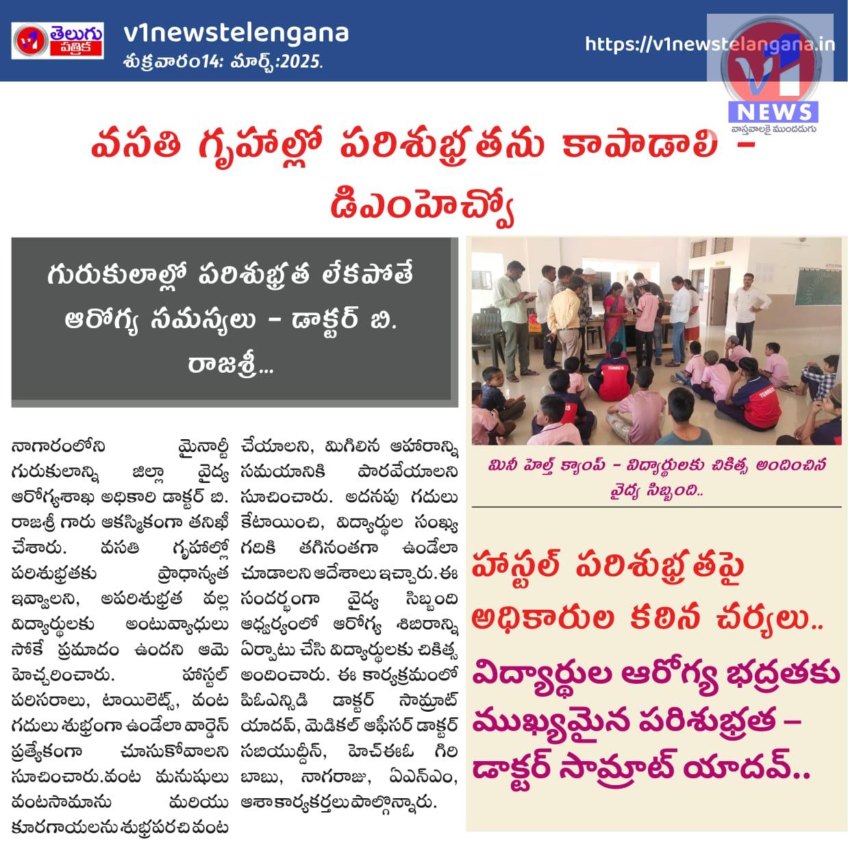 వసతి గృహాల్లో పరిశుభ్రతను కాపాడాలి – డిఎంహెచ్వో గురుకులాల్లో పరిశుభ్రత లేకపోతే ఆరోగ్య సమస్యలు – డాక్టర్ బి. రాజశ్రీ… . మినీ హెల్త్ క్యాంప్ – విద్యార్థులకు చికిత్స అందించిన వైద్య సిబ్బంది…  హాస్టల్ పరిశుభ్రతపై అధికారుల కఠిన చర్యలు..