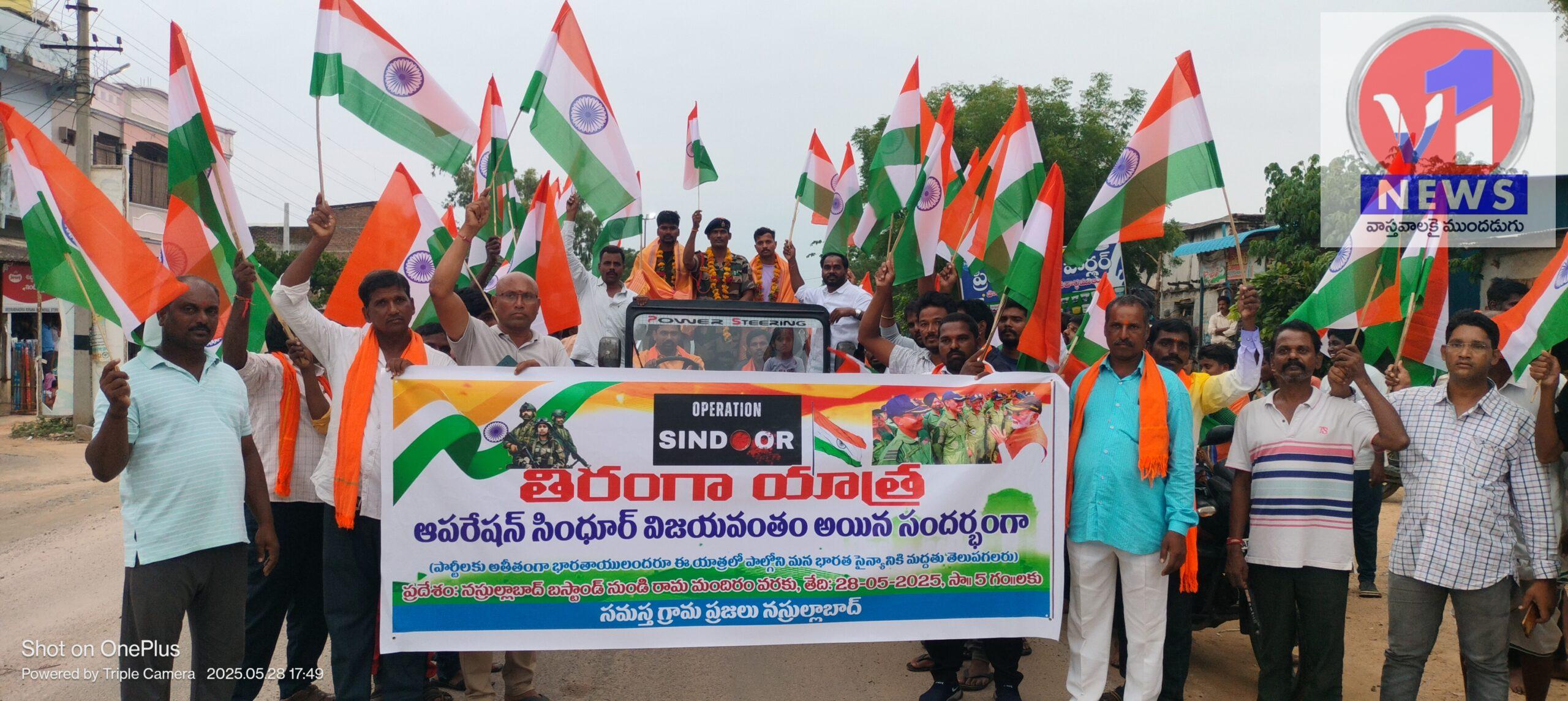 కామారెడ్డి జిల్లా: నసురుల్లాబాద్ మండల కేంద్రంలో బుధవారం రోజు భారతీయ జనతా పార్టీ జిల్లా కౌన్సిల్ మెంబర్ సున్నం సాయిలు ఆధ్వర్యంలో ఆపరేషన్ సింధూర్ విజయవంతమైన సందర్భంగా సైనికుల సేవలను, వారి త్యాగాలను గుర్తిస్తూ ఘనంగా తిరంగా ర్యాలీ నిర్వహించారు. ఈ కార్యక్రమంలో రాజకీయాలకు అతీతంగా నాయకులు, కార్యకర్తలు, యువకులు అధిక సంఖ్యలో పాల్గొన్నారు.ఈ క్రమంలో కామప్ప మందిరం నుండి రామాలయం వరకు భారీ ర్యాలీ నిర్వహించారు. దీనిలో భాగంగా ప్రయాణ ప్రాంగణం ఆవరణలో బాన్సువాడ నియోజకవర్గం నుండి ఆర్మీలో సేవలందిస్తున్న సైనికులు మాజీ సైనికులు సంజీవ్ కుమార్, సర్వీస్ సైనికులు రామకృష్ణ, మహమ్మద్ షరీఫ్, సతీష్ లను పూలమాలలు, శాలువాలతో ఘనంగా సన్మానించారు. ఈ సందర్భంగా సున్నం సాయిలు మాట్లాడుతూ పాక్ ఉగ్రదాడులను ప్రతిఘటిస్తూ భారత ప్రభుత్వం చేసిన ఆపరేషన్ సింధూర్ విజయవంతం కావడంతో యుద్ధంలో సైనికులు అందించిన సేవలను ఆయన కొనియాడారు. సైనికులు పగలనకా ,రాత్రనక , భార్య పిల్లలను, తల్లిదండ్రులను వదిలిపెట్టి నిద్రాహారాలు మానుకొని సేవలందించడం వలన మనము ప్రశాంతంగా జీవించగలుగుతున్నామని అన్నారు.