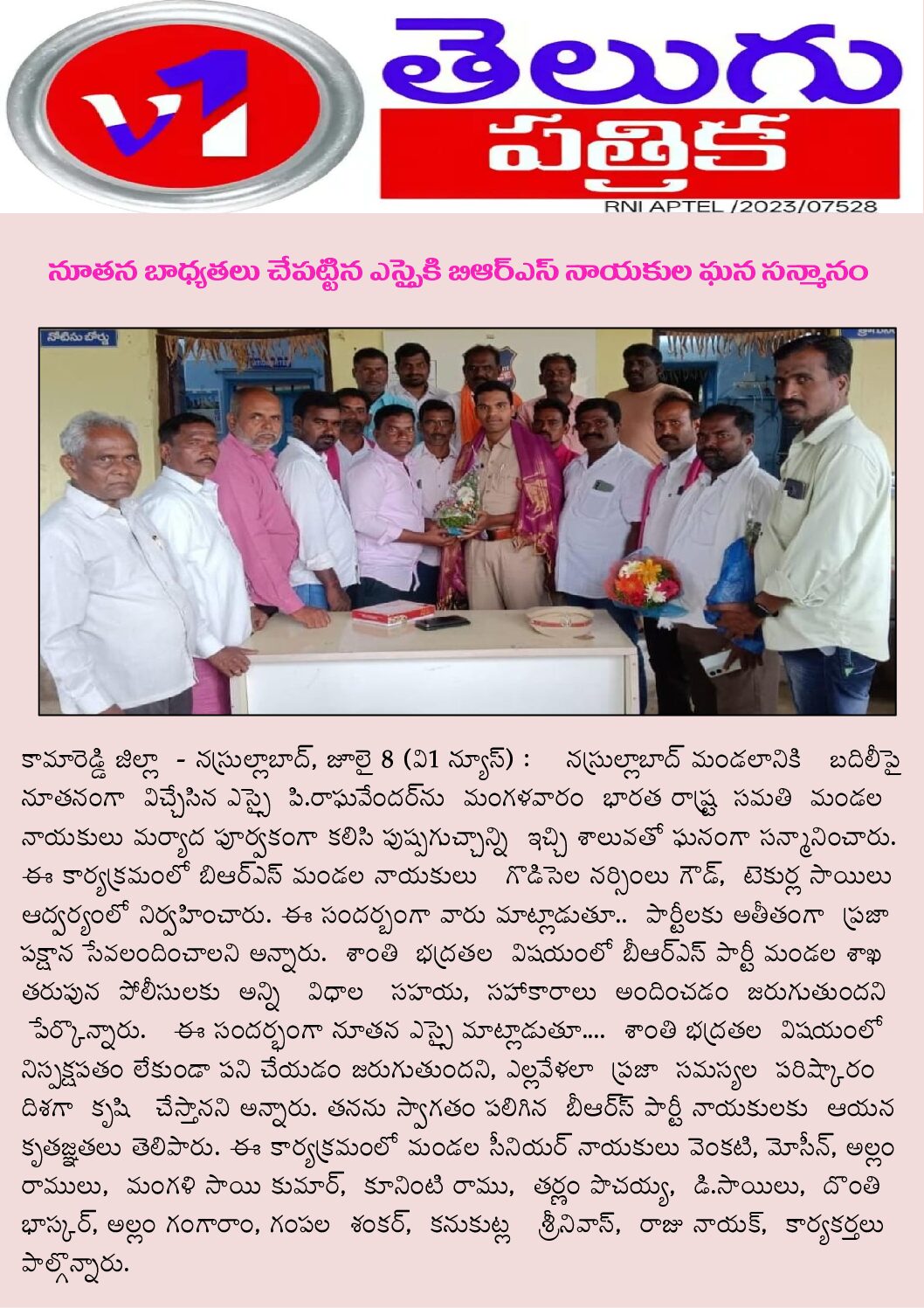 కామారెడ్డి జిల్లా: బాన్సువాడ నియోజకవర్గంలోని నసురుల్లాబాద్ మండలానికి బదిలీపై వచ్చి విధులు నిర్వహిస్తున్న నూతన ఎస్సై పి. రాఘవేందర్ ను మంగళవారం రోజు బిఆర్ఎస్ పార్టీ మండల నాయకులు గొడిసెల నర్సింలు గౌడ్ మరియు టేకుర్ల సాయిలు ఆధ్వర్యంలో నాయకులు, కార్యకర్తలు అందరూ మర్యాదపూర్వకంగా కలిసి పుష్పగుచ్చాన్ని అందించి శాలువాతో ఘనంగా సన్మానించారు. ఈ క్రమంలో వారు పరస్పరం మిఠాయిలు పంచుకొని స్వాగతం పలికారు. ఈ సందర్భంగా మండల నాయకులు గొడిసెల నర్సింలు గౌడ్ మాట్లాడుతూ అంకితభావంతో విధులు నిర్వహిస్తూ ప్రజల సమస్యలను పరిష్కరించాలని కోరారు. ఎల్లప్పుడూ పోలీసులకు సహకారం అందిస్తామని తెలిపారు. ఈ కార్యక్రమంలో మండల సీనియర్ నాయకులు వెంకటి, మోసీన్,అల్లం రాములు, మంగళి సాయి కుమార్, కూనింటి రాము, తర్ణం పోచయ్య, డి. సాయిలు, దొంతి భాస్కర్, అల్లం గంగారం, గంపల శంకర్, కనుకుట్ల శ్రీనివాస్, రాజు నాయక్, కార్యకర్తలు తదితరులు పాల్గొన్నారు.