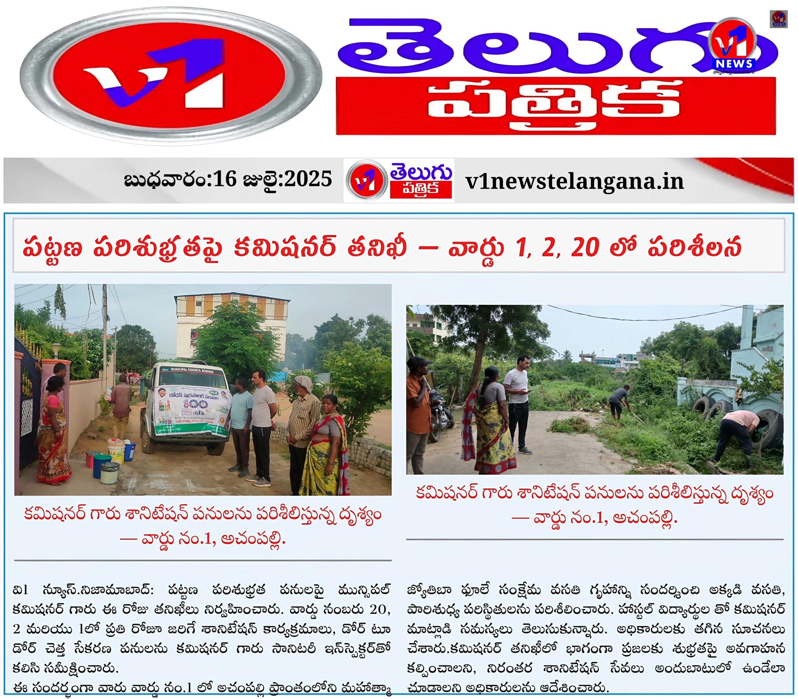 పట్టణ పరిశుభ్రతపై కమిషనర్ తనిఖీ — వార్డు 1, 2, 20 లో పరిశీలన