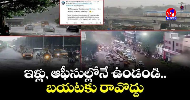 భారీ వర్షం కురుస్తుండటంతో ఇళ్లల్లో ఉన్నవాళ్లు బయటికి వెళ్లవద్దని సూచించారు హైదరాబాద్ సిటీ పోలీసులు. అదే విధంగా ఆఫీసుల్లో ఉన్న వాళ్లు వర్షం నిలిచే వరకు బయల్దేరవద్దని హెచ్చరించారు. భారీగా వరద పారుతుండటంతో రోడ్లపైన వాహనాలు కొట్టుకుపోయే ప్రమాదం ఉందని హెచ్చరించారు. భారీగా ట్రాఫిక్ జాం అయ్యే అవకాశం ఉండటంతో వర్షం కాస్త రిలీఫ్ ఇచ్చిన తర్వాతే బయలు దేరాలని సూచించారు పోలీసులు.