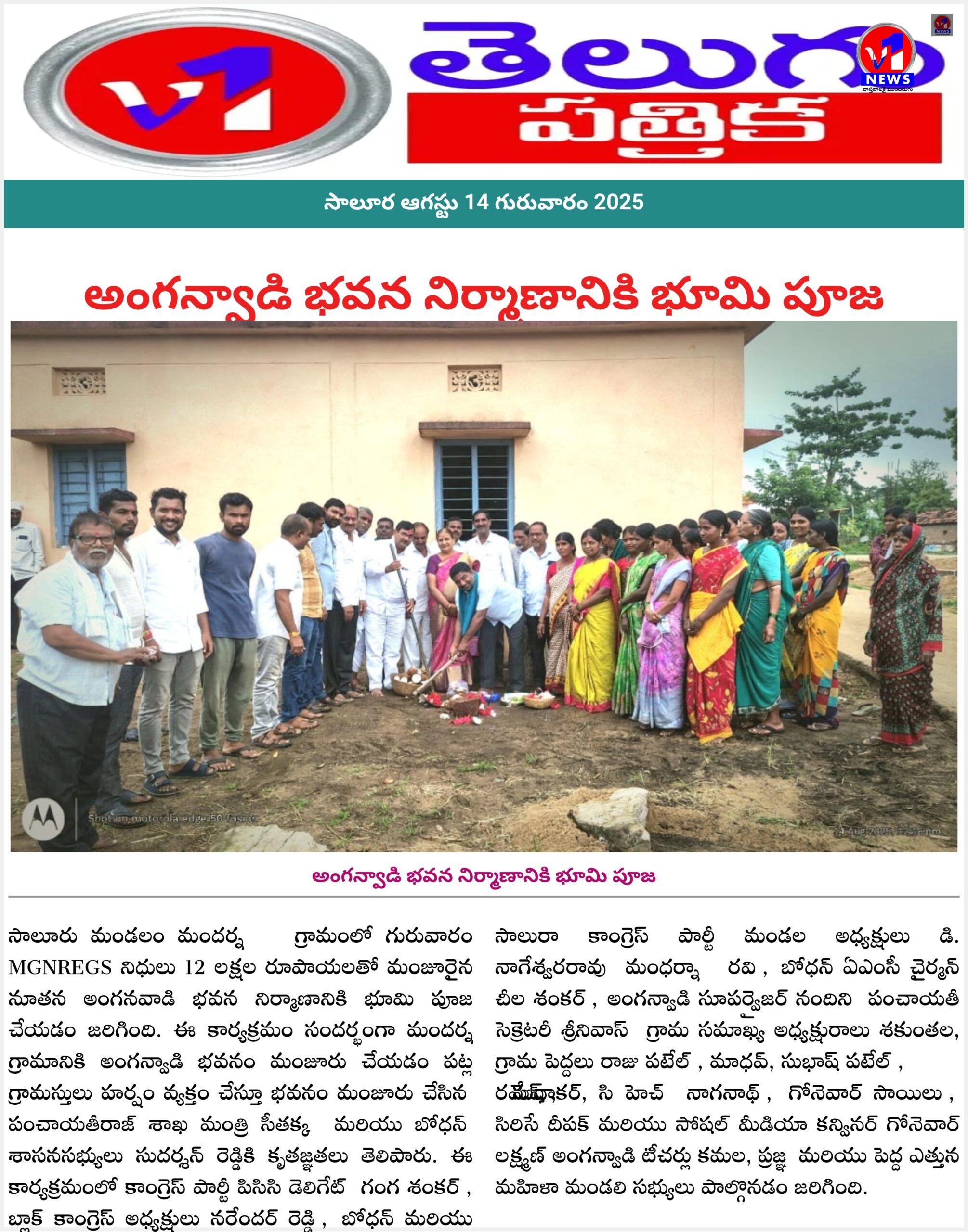 సాలూర ఆగస్టు 14 V1 సాలూరు మండలం మందర్న గ్రామంలో గురువారం MGNREGS నిధులు 12 లక్షల రూపాయలతో మంజూరైన నూతన అంగనవాడి భవన నిర్మాణానికి భూమి పూజ చేయడం జరిగింది.