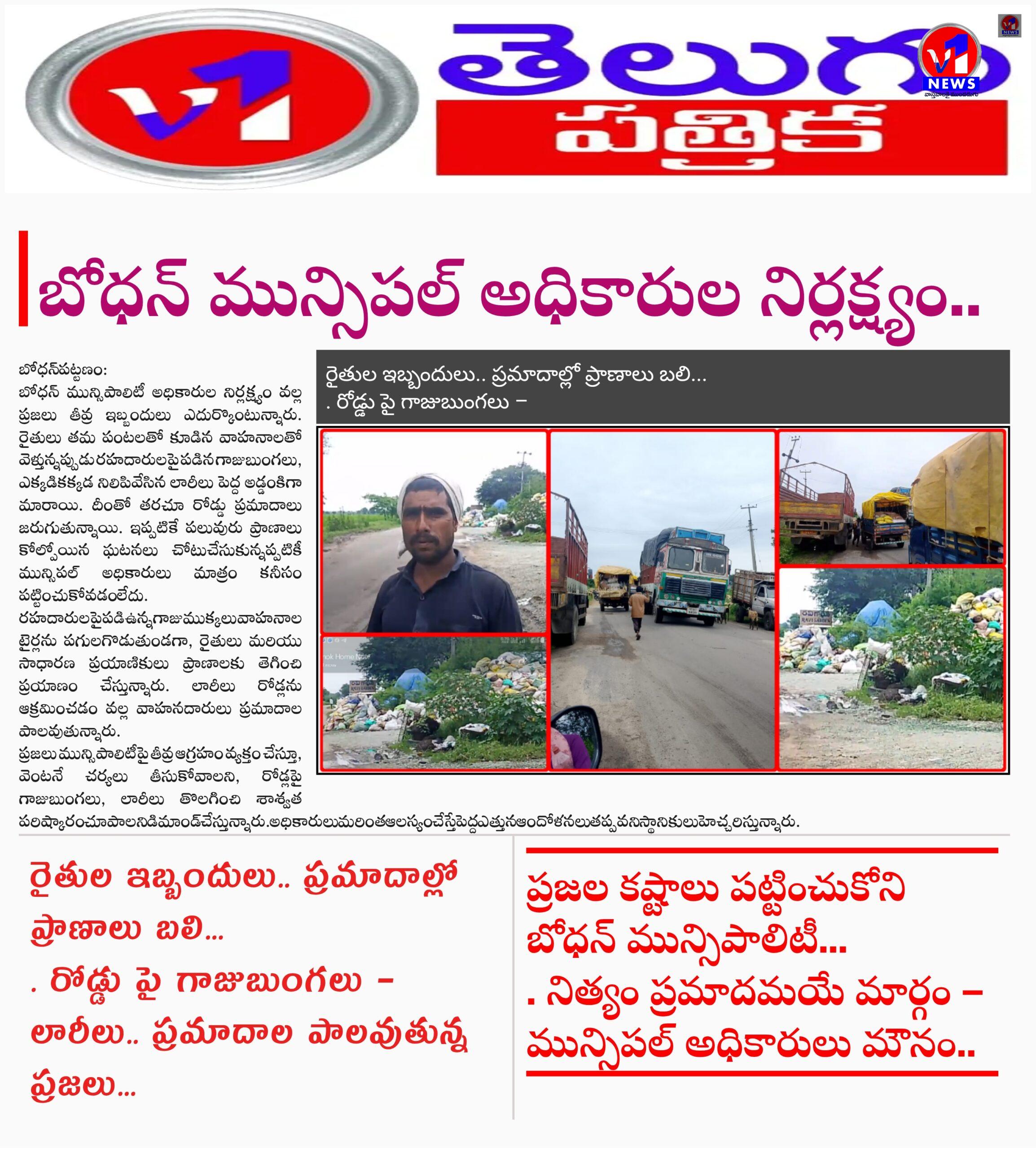 బోధన్ మున్సిపాలిటీ అధికారుల నిర్లక్ష్యం వల్ల ప్రజలు తీవ్ర ఇబ్బందులు ఎదుర్కొంటున్నారు. రైతులు తమ పంటలతో కూడిన వాహనాలతో వెళ్తున్నప్పుడు రహదారులపై పడిన గాజుబుంగలు, ఎక్కడికక్కడ నిలిపివేసిన లారీలు పెద్ద అడ్డంకిగా మారాయి. దీంతో తరచూ రోడ్డు ప్రమాదాలు జరుగుతున్నాయి. ఇప్పటికే పలువురు ప్రాణాలు కోల్పోయిన ఘటనలు చోటుచేసుకున్నప్పటికీ మున్సిపల్ అధికారులు మాత్రం కనీసం పట్టించుకోవడం లేదు.