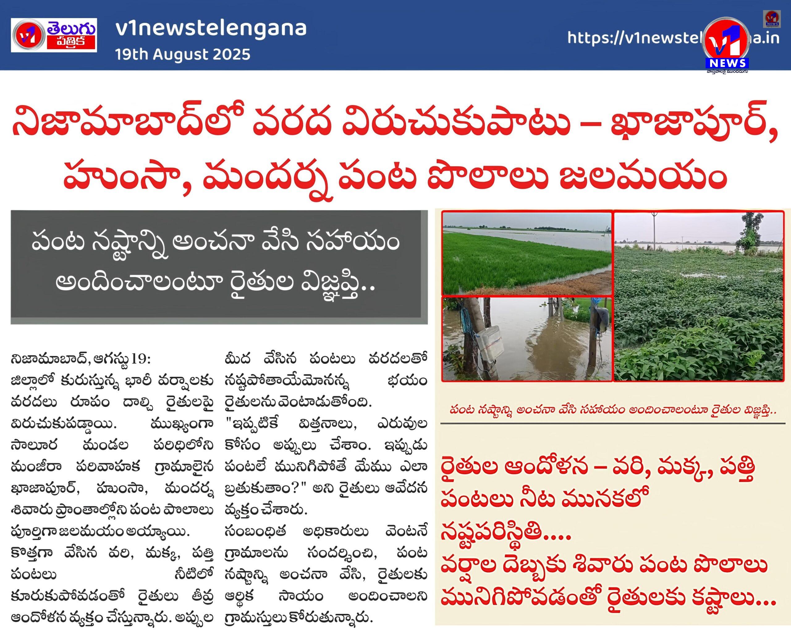 జిల్లాలో కురుస్తున్న భారీ వర్షాలకు వరదలు రూపం దాల్చి రైతులపై విరుచుకుపడ్డాయి. ముఖ్యంగా సాలూర మండల పరిధిలోని మంజీరా పరివాహక గ్రామాలైన ఖాజాపూర్, హుంసా, మందర్న శివారు ప్రాంతాల్లోని పంట పొలాలు పూర్తిగా జలమయం అయ్యాయి.