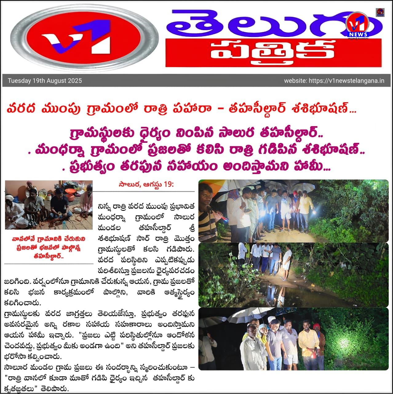 నిన్న రాత్రి వరద ముంపు ప్రభావిత మంధర్నా గ్రామంలో సాలుర మండల తహసీల్దార్ శ్రీ శశిభూషణ్. రాత్రి మొత్తం గ్రామస్థులతో కలసి గడిపారు. వరద పరిస్థితిని ఎప్పటికప్పుడు పరిశీలిస్తూ ప్రజలను ధైర్యపరచడం జరిగింది. వర్షంలోనూ గ్రామానికి చేరుకున్న ఆయన, గ్రామ ప్రజలతో కలిసి భజన కార్యక్రమంలో పాల్గొని, వారికి ఆత్మస్థైర్యం కలిగించారు.