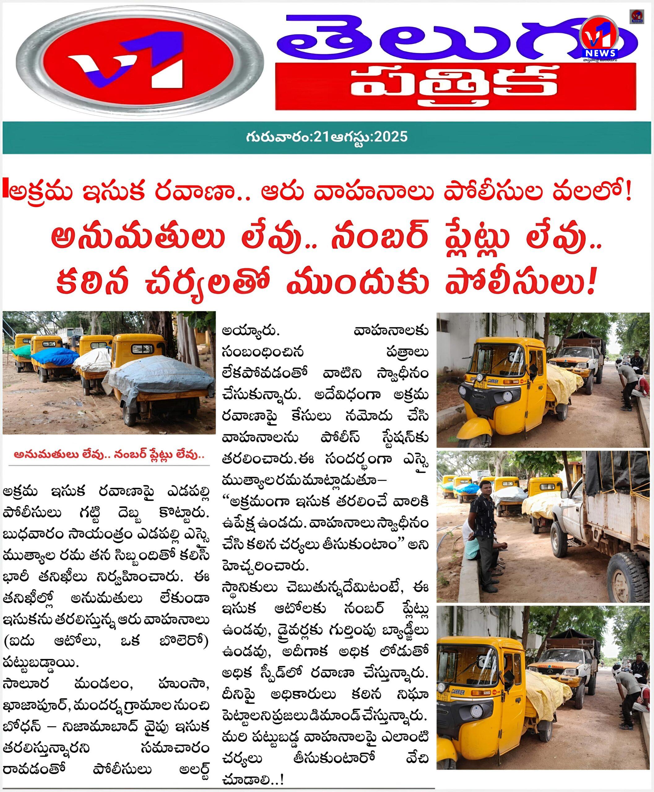 ఎడపల్లి మండలం:అక్రమ ఇసుక రవాణాపై ఎడపల్లి పోలీసులు గట్టి దెబ్బ కొట్టారు. బుధవారం సాయంత్రం ఎడపల్లి ఎస్సై ముత్యాల రమ తన సిబ్బందితో కలిసి భారీ తనిఖీలు నిర్వహించారు. ఈ తనిఖీల్లో అనుమతులు లేకుండా ఇసుకను తరలిస్తున్న ఆరు వాహనాలు (ఐదు ఆటోలు, ఒక బొలెరో) పట్టుబడ్డాయి..