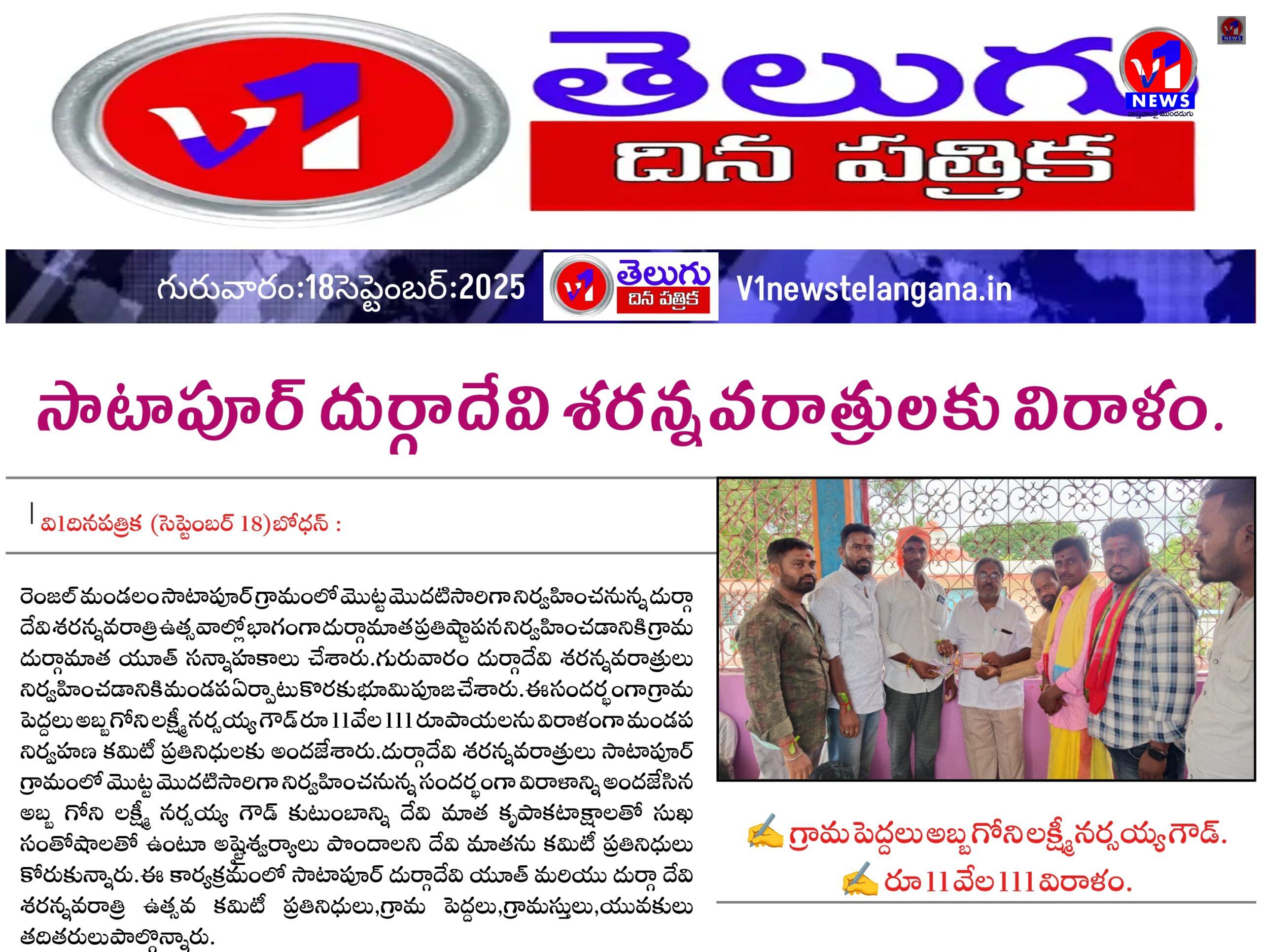 బోధన్ : రెంజల్ మండలం సాటాపూర్ గ్రామంలో మొట్ట మొదటిసారిగా నిర్వహించనున్న దుర్గా దేవి శరన్నవరాత్రి ఉత్సవాల్లో భాగంగా దుర్గామాత ప్రతిష్టాపన నిర్వహించడానికి గ్రామ దుర్గామాత యూత్ సన్నాహకాలు చేశారు.గురువారం దుర్గాదేవి శరన్నవరాత్రులు నిర్వహించడానికి మండప ఏర్పాటు కొరకు భూమి పూజ చేశారు.ఈ సందర్భంగా గ్రామ పెద్దలు అబ్బగోని లక్ష్మీ నర్సయ్య గౌడ్ రూ 11వేల 111 రూపాయలను విరాళంగా మండప నిర్వహణ కమిటీ ప్రతినిధులకు అందజేశారు.దుర్గాదేవి శరన్నవరాత్రులు సాటాపూర్ గ్రామంలో మొట్ట మొదటిసారిగా నిర్వహించనున్న సందర్భంగా విరాళాన్ని అందజేసిన అబ్బ గోని లక్ష్మీ నర్సయ్య గౌడ్ కుటుంబాన్ని దేవి మాత కృపాకటాక్షాలతో సుఖ సంతోషాలతో ఉంటూ అష్టైశ్వర్యాలు పొందాలని దేవి మాతను కమిటీ ప్రతినిధులు కోరుకున్నారు.ఈ కార్యక్రమంలో సాటాపూర్ దుర్గాదేవి యూత్ మరియు దుర్గా దేవి శరన్నవరాత్రి ఉత్సవ కమిటీ ప్రతినిధులు,గ్రామ పెద్దలు,గ్రామస్తులు,యువకులు తదితరులు పాల్గొన్నారు.