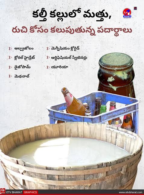 కల్తీ కల్లు తయారీలో క్లోరో హైడ్రెడ్, డైజోఫామ్, అల్ట్రాజోలం వంటి ప్రమాదకర రసాయనాలను కలుపుతున్నారని ఆరోపణలు వెల్లువెత్తుతున్నాయి. వీటి వలన నాడీవ్యవస్థ దెబ్బతిని, ఆరోగ్య సమస్యలు తీవ్రంగా పెరుగుతున్నాయని వైద్యులు హెచ్చరిస్తున్నారు.
