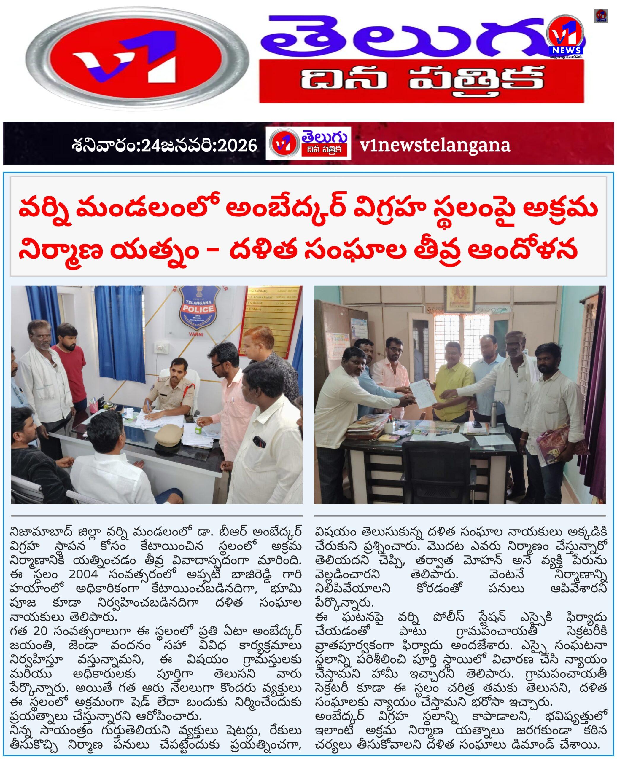 నిజామాబాద్ జిల్లా వర్ని మండలంలో డా. బీఆర్ అంబేద్కర్ విగ్రహ స్థాపన కోసం కేటాయించిన స్థలంలో అక్రమ నిర్మాణానికి యత్నించడం తీవ్ర వివాదాస్పదంగా మారింది. ఈ స్థలం 2004 సంవత్సరంలో అప్పటి బాజిరెడ్డి గారి హయాంలో అధికారికంగా కేటాయించబడినదిగా, భూమి పూజ కూడా నిర్వహించబడినదిగా దళిత సంఘాల నాయకులు తెలిపారు.