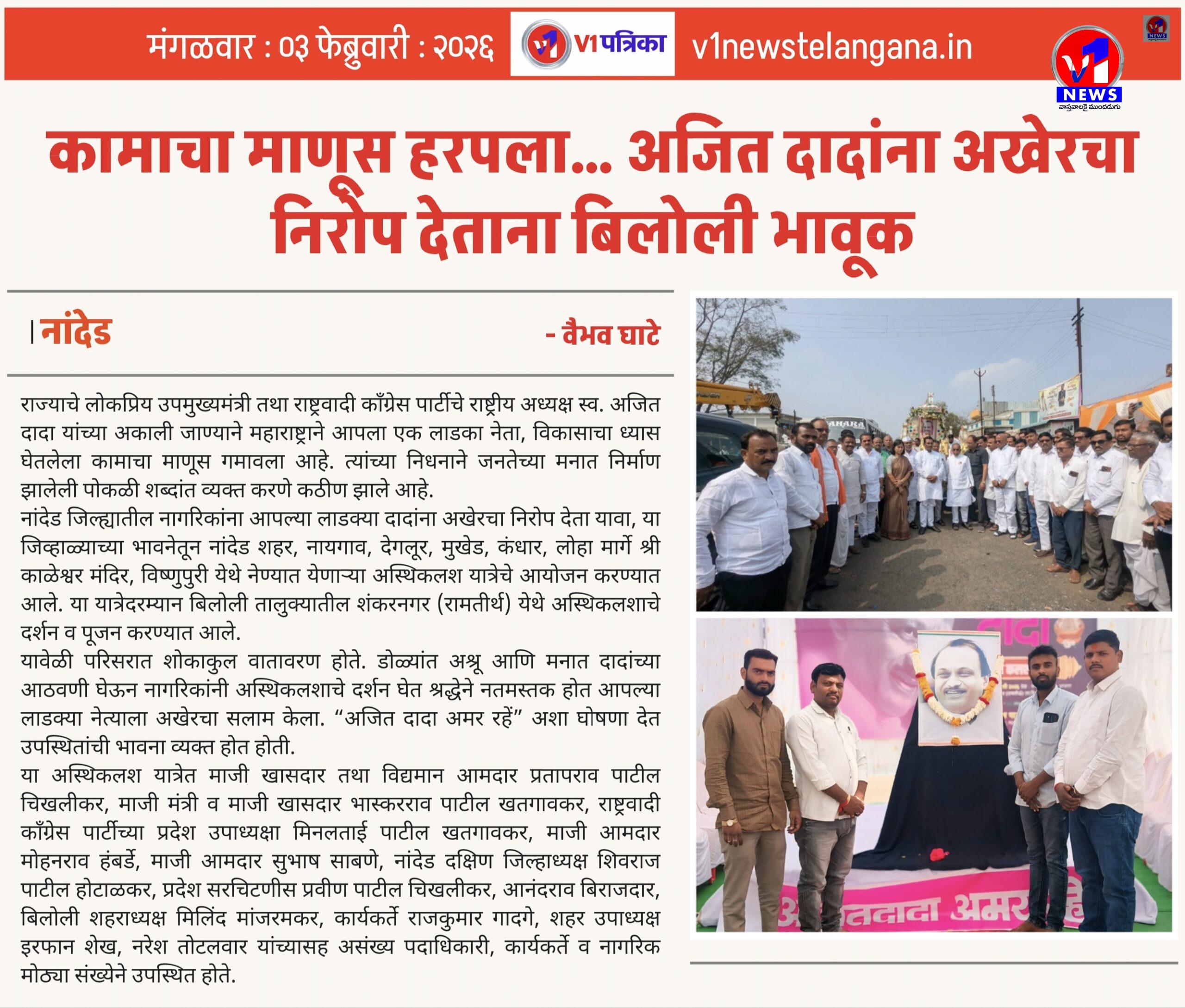 यावेळी परिसरात शोकाकुल वातावरण होते. डोळ्यांत अश्रू आणि मनात दादांच्या आठवणी घेऊन नागरिकांनी अस्थिकलशाचे दर्शन घेत श्रद्धेने नतमस्तक होत आपल्या लाडक्या नेत्याला अखेरचा सलाम केला. “अजित दादा अमर रहें” अशा घोषणा देत उपस्थितांची भावना व्यक्त होत होती.
