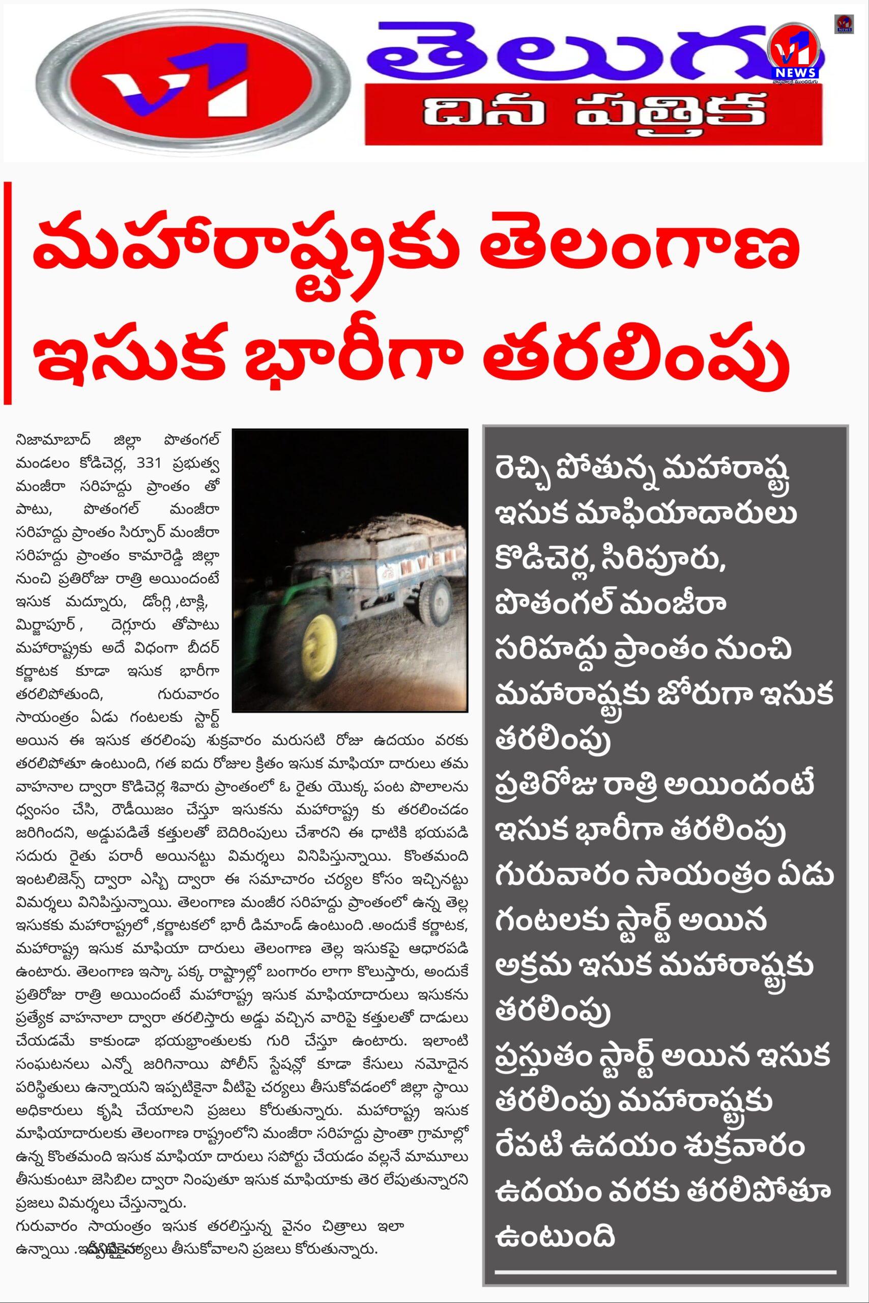 నిజామాబాద్ జిల్లా పొతంగల్ మండలం కోడిచెర్ల, 331 ప్రభుత్వ మంజీరా సరిహద్దు ప్రాంతం తో పాటు, పొతంగల్ మంజీరా సరిహద్దు ప్రాంతం సిర్పూర్ మంజీరా సరిహద్దు ప్రాంతం కామారెడ్డి జిల్లా నుంచి ప్రతిరోజు రాత్రి అయిందంటే ఇసుక మద్నూరు, డోంగ్లి ,టాక్లి, మిర్జాపూర్ , దెగ్లూరు తోపాటు మహారాష్ట్రకు అదే విధంగా బీదర్ కర్ణాటక కూడా ఇసుక భారీగా తరలిపోతుంది, గురువారం సాయంత్రం ఏడు గంటలకు స్టార్ట్ అయిన ఈ ఇసుక తరలింపు శుక్రవారం మరుసటి రోజు ఉదయం వరకు తరలిపోతూ ఉంటుంది, గత ఐదు రోజుల క్రితం ఇసుక మాఫియా దారులు తమ వాహనాల ద్వారా కొడిచెర్ల శివారు ప్రాంతంలో ఓ రైతు యొక్క పంట పొలాలను ధ్వంసం చేసి, రౌడీయిజం చేస్తూ ఇసుకను మహారాష్ట్ర కు తరలించడం జరిగిందని, అడ్డుపడితే కత్తులతో బెదిరింపులు చేశారని ఈ ధాటికి భయపడి సదురు రైతు పరారీ అయినట్టు విమర్శలు వినిపిస్తున్నాయి. కొంతమంది ఇంటలిజెన్స్ ద్వారా ఎస్బి ద్వారా ఈ సమాచారం చర్యల కోసం ఇచ్చినట్టు విమర్శలు వినిపిస్తున్నాయి. తెలంగాణ మంజీర సరిహద్దు ప్రాంతంలో ఉన్న తెల్ల ఇసుకకు మహారాష్ట్రలో ,కర్ణాటకలో భారీ డిమాండ్ ఉంటుంది .అందుకే కర్ణాటక, మహారాష్ట్ర ఇసుక మాఫియా దారులు తెలంగాణ తెల్ల ఇసుకపై ఆధారపడి ఉంటారు. తెలంగాణ ఇస్కా పక్క రాష్ట్రాల్లో బంగారం లాగా కొలుస్తారు, అందుకే ప్రతిరోజు రాత్రి అయిందంటే మహారాష్ట్ర ఇసుక మాఫియాదారులు ఇసుకను ప్రత్యేక వాహనాలా ద్వారా తరలిస్తారు అడ్డు వచ్చిన వారిపై కత్తులతో దాడులు చేయడమే కాకుండా భయభ్రాంతులకు గురి చేస్తూ ఉంటారు. ఇలాంటి సంఘటనలు ఎన్నో జరిగినాయి పోలీస్ స్టేషన్లో కూడా కేసులు నమోదైన పరిస్థితులు ఉన్నాయని ఇప్పటికైనా వీటిపై చర్యలు తీసుకోవడంలో జిల్లా స్థాయి అధికారులు కృషి చేయాలని ప్రజలు కోరుతున్నారు. మహారాష్ట్ర ఇసుక మాఫియాదారులకు తెలంగాణ రాష్ట్రంలోని మంజీరా సరిహద్దు ప్రాంతా గ్రామాల్లో ఉన్న కొంతమంది ఇసుక మాఫియా దారులు సపోర్టు చేయడం వల్లనే మామూలు తీసుకుంటూ జెసిబిల ద్వారా నింపుతూ ఇసుక మాఫియాకు తెర లేపుతున్నారని ప్రజలు విమర్శలు చేస్తున్నారు.