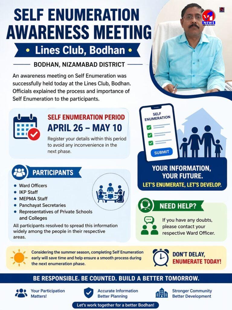నిజామాబాద్ జిల్లా బోధన్ పట్టణంలోని లైన్స్ క్లబ్‌లో సెల్ఫ్ ఎన్యూమరేషన్ (Self Enumeration) పై అవగాహన సదస్సు ఘనంగా నిర్వహించారు. ఈ కార్యక్రమంలో అధికారులు ప్రజలకు సెల్ఫ్ ఎన్యూమరేషన్ ప్రక్రియ, దాని ప్రాధాన్యం గురించి వివరించారు.