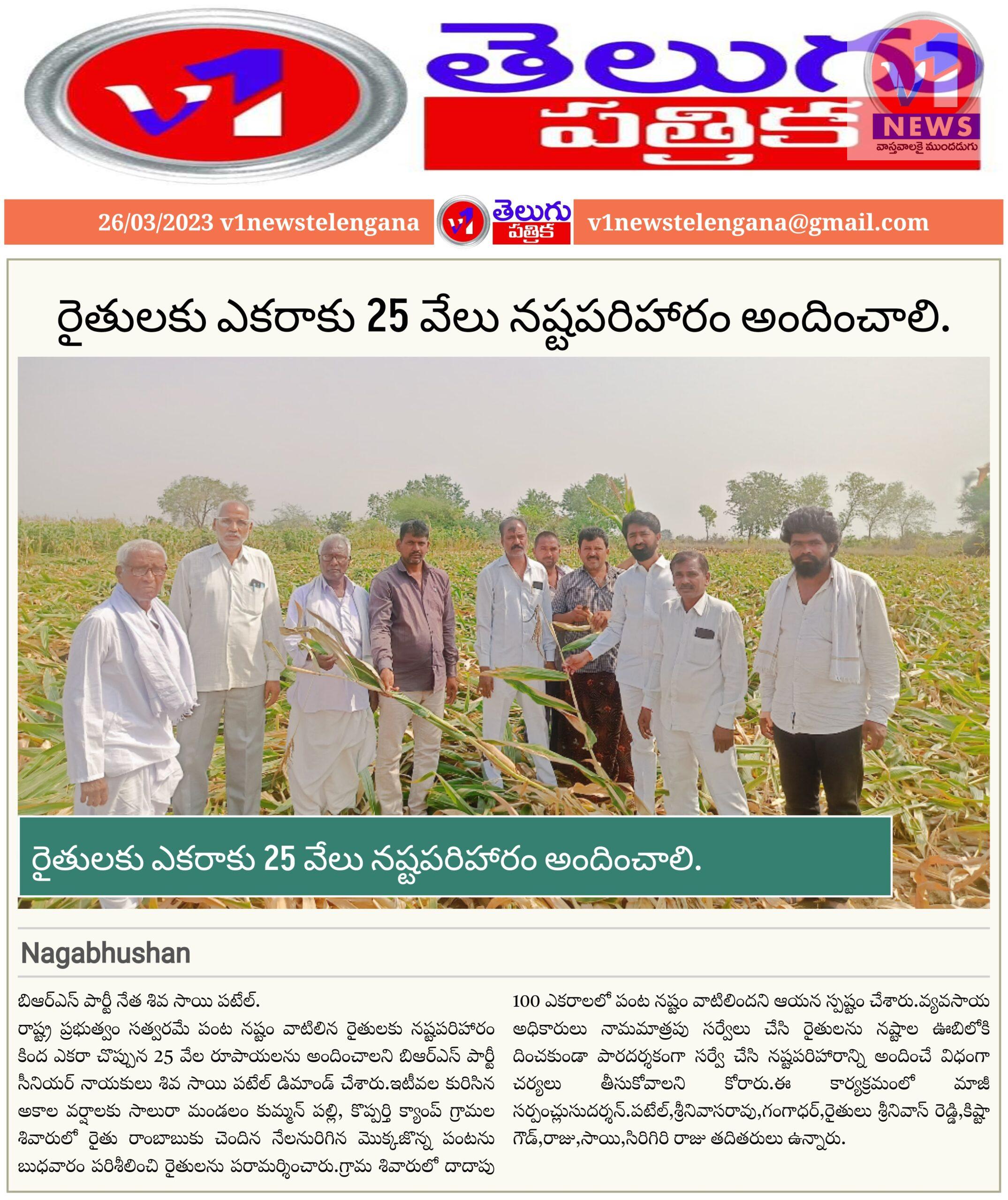 బిఆర్ఎస్ పార్టీ నేత శివ సాయి పటేల్.రాష్ట్ర ప్రభుత్వం సత్వరమే పంట నష్టం వాటిలిన రైతులకు నష్టపరిహారం కింద ఎకరా చొప్పున 25 వేల రూపాయలను అందించాలని బిఆర్ఎస్ పార్టీ సీనియర్ నాయకులు శివ సాయి పటేల్ డిమాండ్ చేశారు.ఇటీవల కురిసిన అకాల వర్షాలకు సాలురా మండలం కుమ్మన్ పల్లి, కొప్పర్తి క్యాంప్ గ్రామల శివారులో రైతు రాంబాబుకు చెందిన నేలనురిగిన మొక్కజొన్న పంటను బుధవారం పరిశీలించి రైతులను పరామర్శించారు.గ్రామ శివారులో దాదాపు 100 ఎకరాలలో పంట నష్టం వాటిలిందని ఆయన స్పష్టం చేశారు.వ్యవసాయ అధికారులు నామమాత్రపు సర్వేలు చేసి రైతులను నష్టాల ఊబిలోకి దించకుండా పారదర్శకంగా సర్వే చేసి నష్టపరిహారాన్ని అందించే విధంగా చర్యలు తీసుకోవాలని కోరారు.ఈ కార్యక్రమంలో మాజీ సర్పంచ్లుసుదర్శన్.పటేల్,శ్రీనివాసరావు,గంగాధర్,రైతులు శ్రీనివాస్ రెడ్డి,కిష్టా గౌడ్,రాజు,సాయి,సిరిగిరి రాజు తదితరులు ఉన్నారు.
