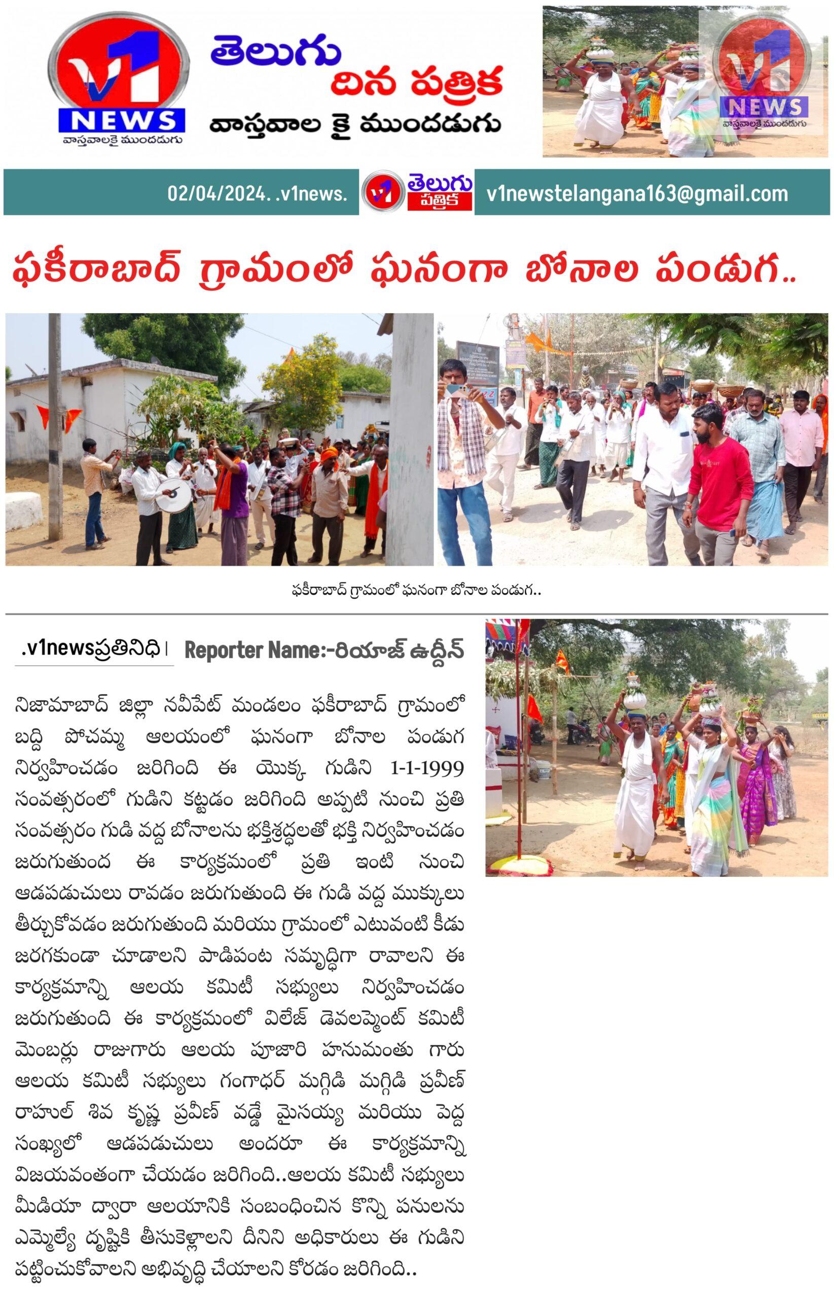నిజామాబాద్ జిల్లా నవీపేట్ మండలం ఫకీరాబాద్ గ్రామంలో బద్ది పోచమ్మ ఆలయంలో ఘనంగా బోనాల పండుగ నిర్వహించడం జరిగింది ఈ యొక్క గుడిని 1-1-1999 సంవత్సరంలో గుడిని కట్టడం జరిగింది అప్పటి నుంచి ప్రతి సంవత్సరం గుడి వద్ద బోనాలను భక్తిశ్రద్ధలతో భక్తి నిర్వహించడం జరుగుతుంద ఈ కార్యక్రమంలో ప్రతి ఇంటి నుంచి ఆడపడుచులు రావడం జరుగుతుంది ఈ గుడి వద్ద ముక్కులు తీర్చుకోవడం జరుగుతుంది మరియు గ్రామంలో ఎటువంటి కీడు జరగకుండా చూడాలని పాడిపంట సమృద్ధిగా రావాలని ఈ కార్యక్రమాన్ని ఆలయ కమిటీ సభ్యులు నిర్వహించడం జరుగుతుంది ఈ కార్యక్రమంలో విలేజ్ డెవలప్మెంట్ కమిటీ మెంబర్లు రాజుగారు ఆలయ పూజారి హనుమంతు గారు ఆలయ కమిటీ సభ్యులు గంగాధర్ మగ్గిడి మగ్గిడి ప్రవీణ్ రాహుల్ శివ కృష్ణ ప్రవీణ్ వడ్డే మైసయ్య మరియు పెద్ద సంఖ్యలో ఆడపడుచులు అందరూ ఈ కార్యక్రమాన్ని విజయవంతంగా చేయడం జరిగింది..ఆలయ కమిటీ సభ్యులు మీడియా ద్వారా ఆలయానికి సంబంధించిన కొన్ని పనులను ఎమ్మెల్యే దృష్టికి తీసుకెళ్లాలని దీనిని అధికారులు ఈ గుడిని పట్టించుకోవాలని అభివృద్ధి చేయాలని కోరడం జరిగింది..