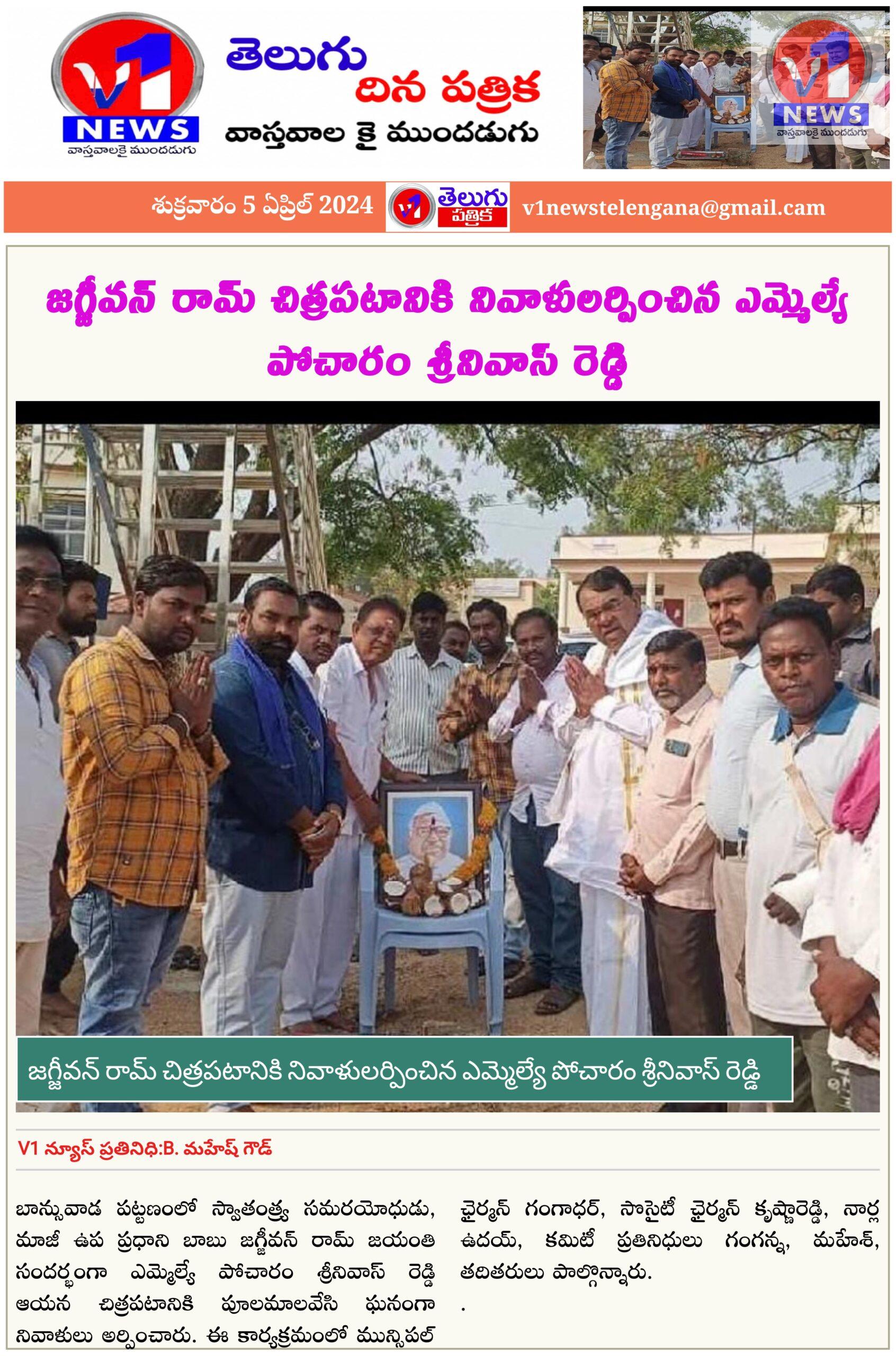 బాన్సువాడ పట్టణంలో స్వాతంత్య్ర సమరయోధుడు, మాజీ ఉప ప్రధాని బాబు జగ్జీవన్ రామ్ జయంతి సందర్భంగా ఎమ్మెల్యే పోచారం శ్రీనివాస్ రెడ్డి ఆయన చిత్రపటానికి పూలమాలవేసి ఘనంగా నివాళులు అర్పించారు. ఈ కార్యక్రమంలో మున్సిపల్ ఛైర్మన్ గంగాధర్, సొసైటీ ఛైర్మన్ కృష్ణారెడ్డి, నార్ల ఉదయ్, కమిటీ ప్రతినిధులు గంగన్న, మహేశ్, తదితరులు పాల్గొన్నారు.