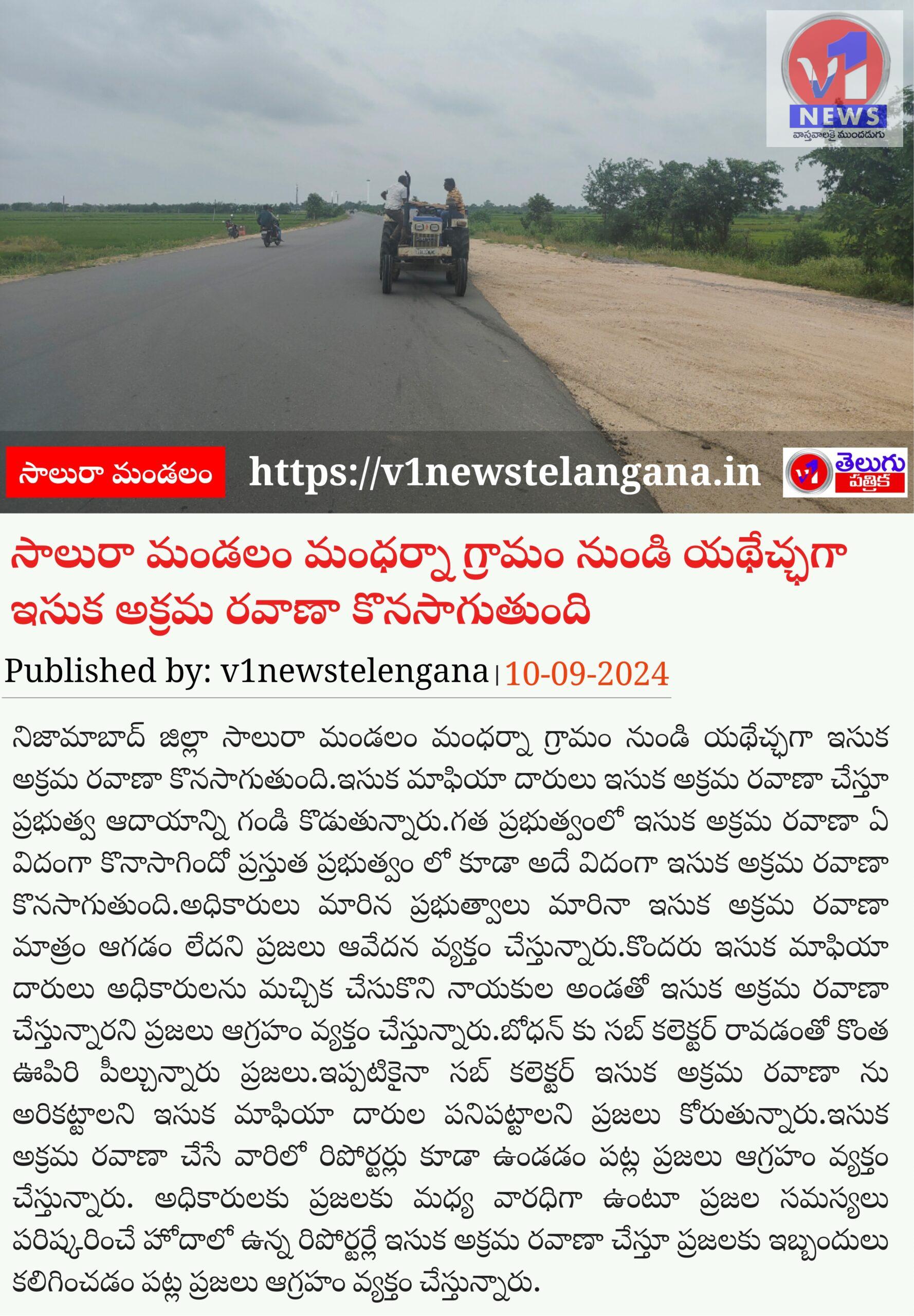 నిజామాబాద్ జిల్లా సాలురా మండలం మంధర్నా గ్రామం నుండి యథేచ్ఛగా ఇసుక అక్రమ రవాణా కొనసాగుతుంది.ఇసుక మాఫియా దారులు ఇసుక అక్రమ రవాణా చేస్తూ ప్రభుత్వ ఆదాయాన్ని గండి కొడుతున్నారు.గత ప్రభుత్వంలో ఇసుక అక్రమ రవాణా ఏ విదంగా కొనాసాగిందో ప్రస్తుత ప్రభుత్వం లో కూడా అదే విదంగా ఇసుక అక్రమ రవాణా కొనసాగుతుంది…