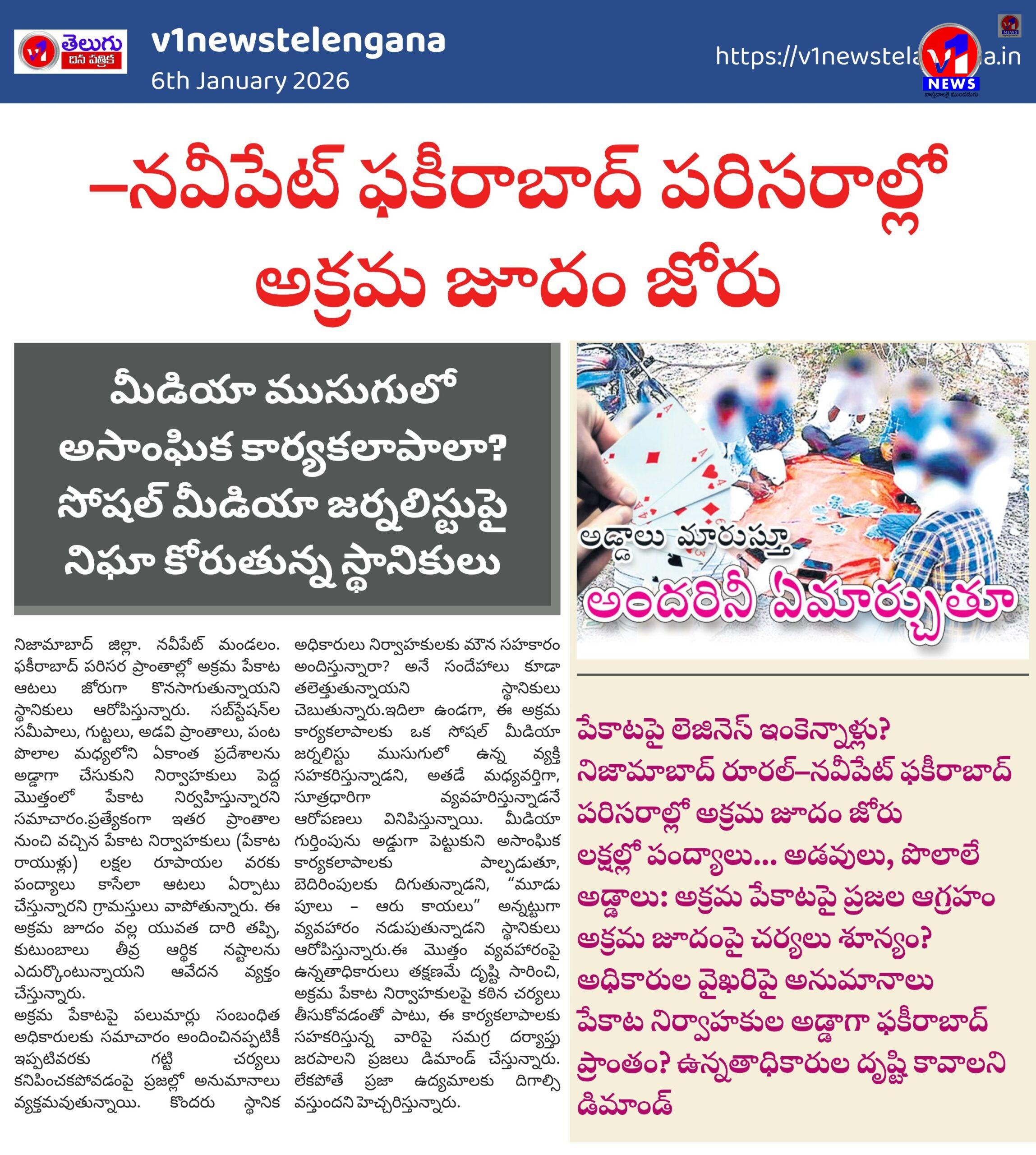 పేకాట సూత్రధారిగా సోషల్ మీడియా రిపోర్టర్ పెన్ కాదు… పేకాట పట్టు!ఫకీరాబాద్ పరిసరాల్లో అక్రమ జూదం జోరు లక్షల్లో పంద్యాలు… అడవులు, పొలాలే అడ్డాలు: January 6, 2026 No Comments