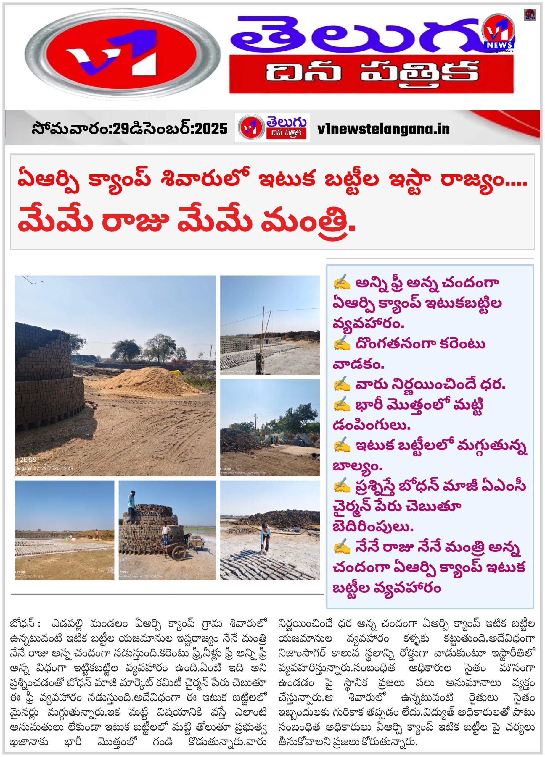 ఏఆర్పి క్యాంప్ శివారులో ఇటుక బట్టీల ఇస్టా రాజ్యం…. మేమే రాజు మేమే మంత్రి. December 29, 2025 No Comments