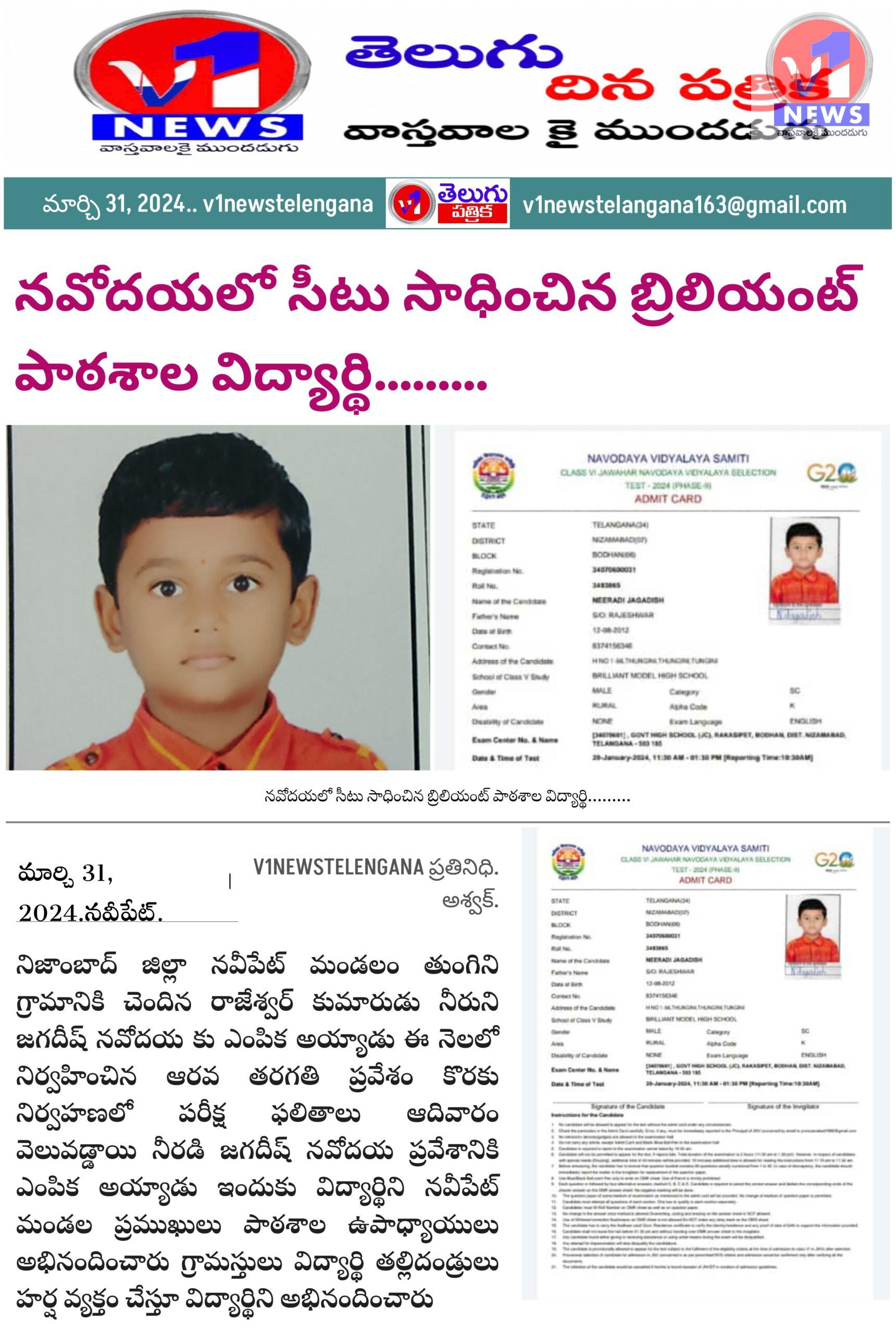 నవోదయలో సీటు సాధించిన బ్రిలియంట్ పాఠశాల విద్యార్థి………