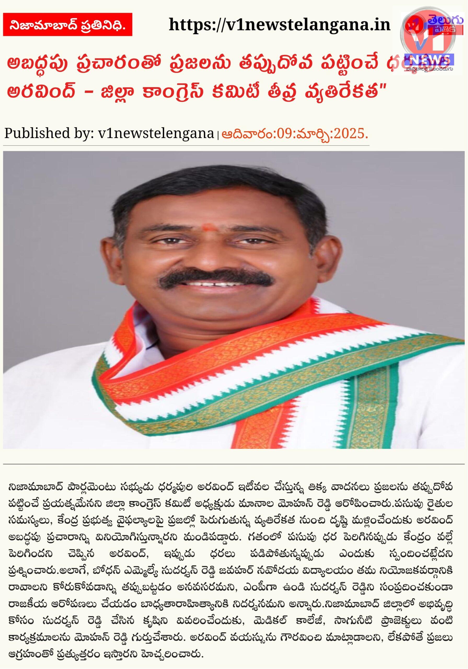 అబద్ధపు ప్రచారంతో ప్రజలను తప్పుదోవ పట్టించే ధర్మపురి అరవింద్ – జిల్లా కాంగ్రెస్ కమిటీ తీవ్ర వ్యతిరేకత” March 9, 2025 No Comments