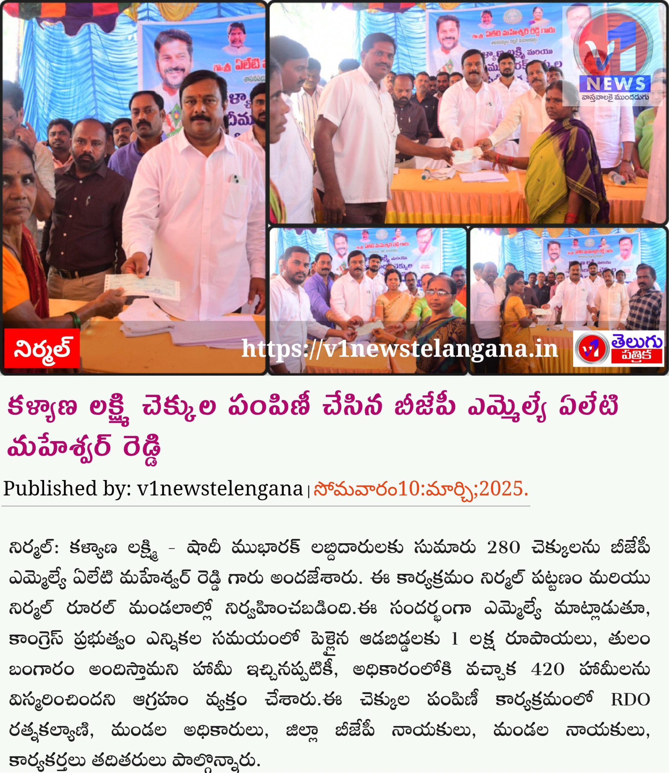 కళ్యాణ లక్ష్మి చెక్కుల పంపిణీ చేసిన బీజేపీ ఎమ్మెల్యే ఏలేటి మహేశ్వర్ రెడ్డి March 10, 2025 No Comments