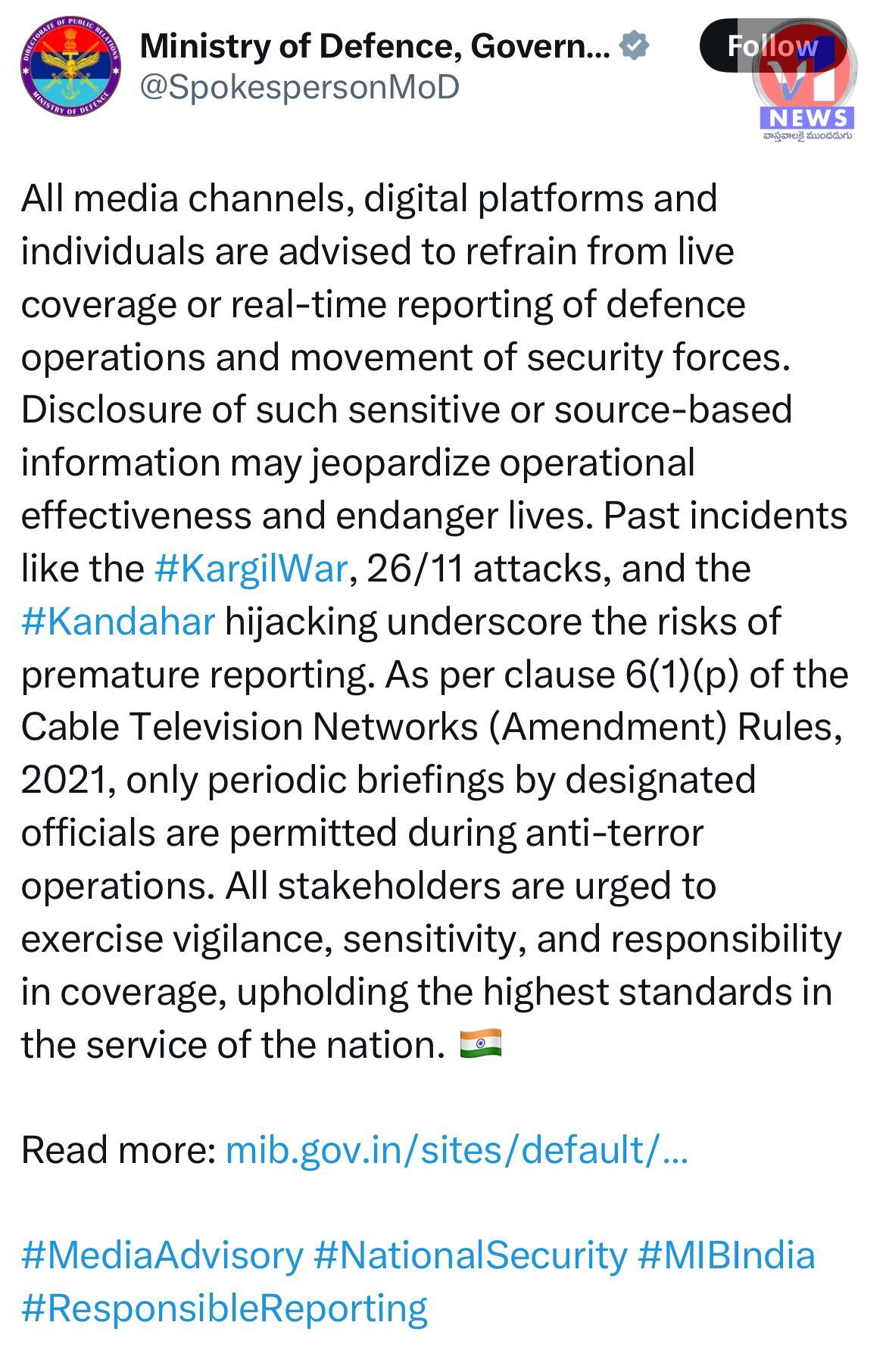 భద్రతా దళాల కదలికలపై ప్రత్యక్ష ప్రసారాలు వద్దు: మినిస్ట్రీ ఆఫ్ డిఫెన్స్ హెచ్చరిక” . “సున్నితమైన సమాచారాన్ని బహిర్గతం చేయొద్దు: మీడియాకు రక్షణ మంత్రిత్వ శాఖ సూచన” “ఆపరేషన్ల రహస్యత్వాన్ని కాపాడండి: మీడియా, సోషల్ మీడియాకు విజ్ఞప్తి” May 9, 2025 No Comments