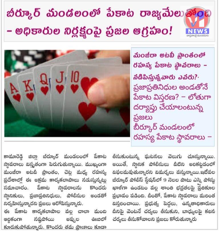 బీర్కూర్లో పేకాట మాఫియా రాజ్యం – ప్రజలు మండిపడుతున్నారు! చట్టం చేతబడి… మంజీరా అరణ్యంలో పేకాట రాజధాని! పేకాటకు ప్రజాప్రతినిధుల ప్రమేయం? – బీర్కూర్లో నేరపూరిత అల్లకల్లోలం! . పోలీసుల కడుపులకే మామూలు? – ప్రజలకు మాత్రం అప్పుల ఊబి! . పేకాట ముఠాలకు అధికారుల ప్రమేయం – ఎవరు నిలుపుతారు ఈ వికృత నాటకం… May 16, 2025 No Comments