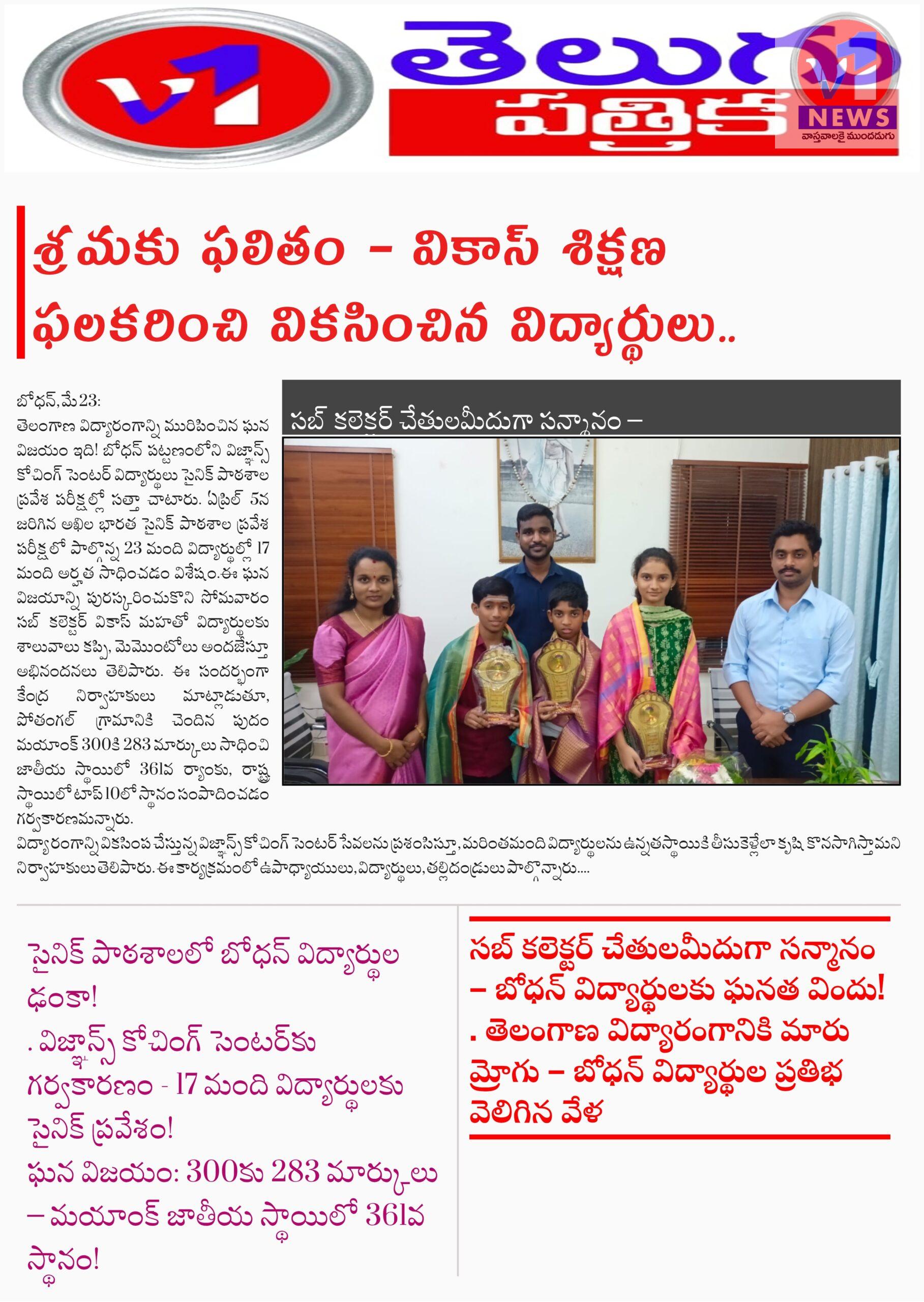 సైనిక్ పాఠశాలల్లో విజ్ఞాన్ విద్యార్థుల ఘన విజయం – 23లో 17 మంది అర్హత సాధింపు… May 23, 2025 No Comments