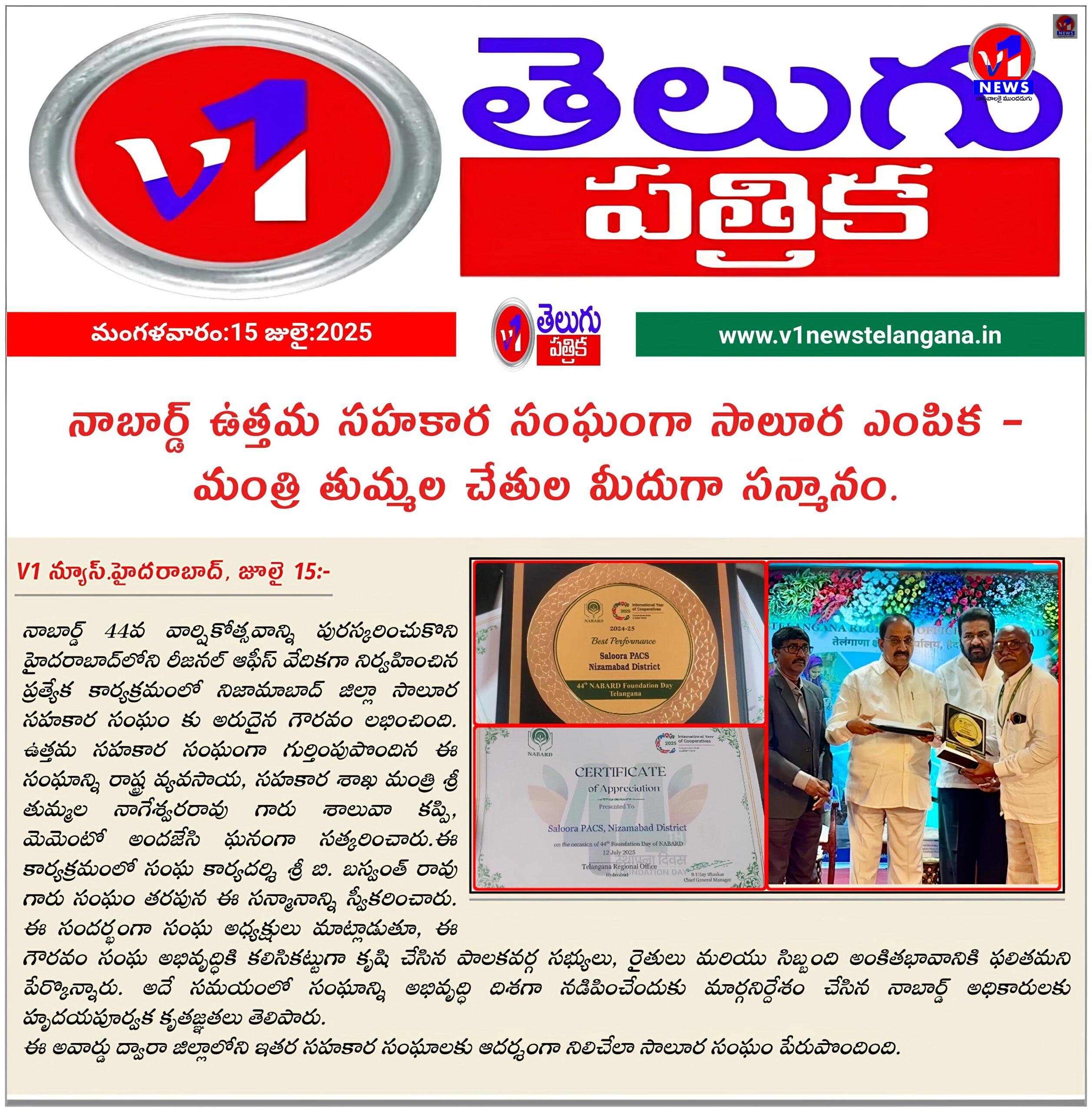 నాబార్డ్ ఉత్తమ సహకార సంఘంగా సాలూర ఎంపిక – మంత్రి తుమ్మల చేతుల మీదుగా సన్మానం.. July 15, 2025 No Comments
