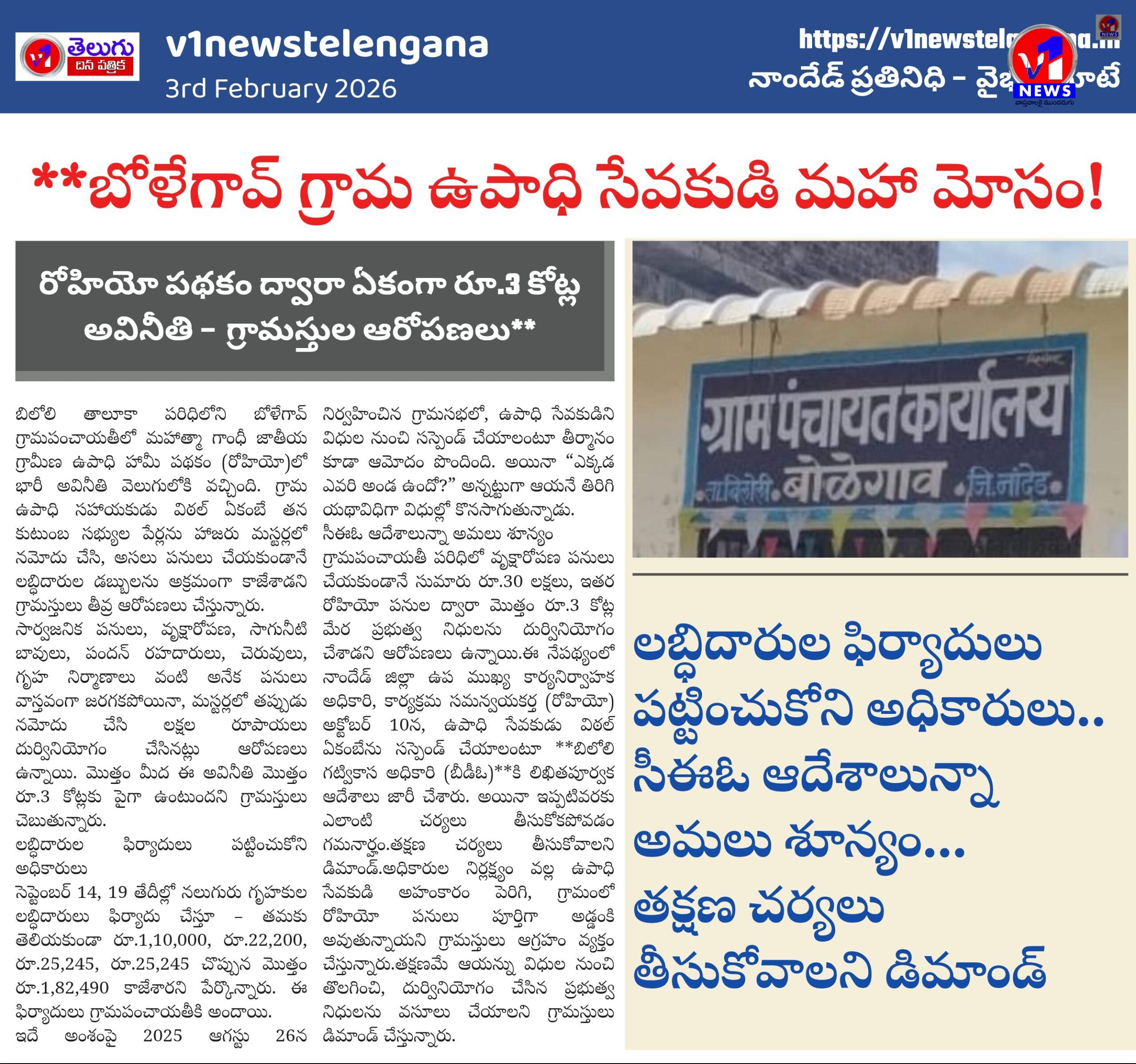 *బోళేగావ్ గ్రామ ఉపాధి సేవకుడి మహా మోసం! రోహియో పథకం ద్వారా ఏకంగా రూ.3 కోట్ల అవినీతి – గ్రామస్తుల ఆరోపణలు** February 3, 2026 No Comments