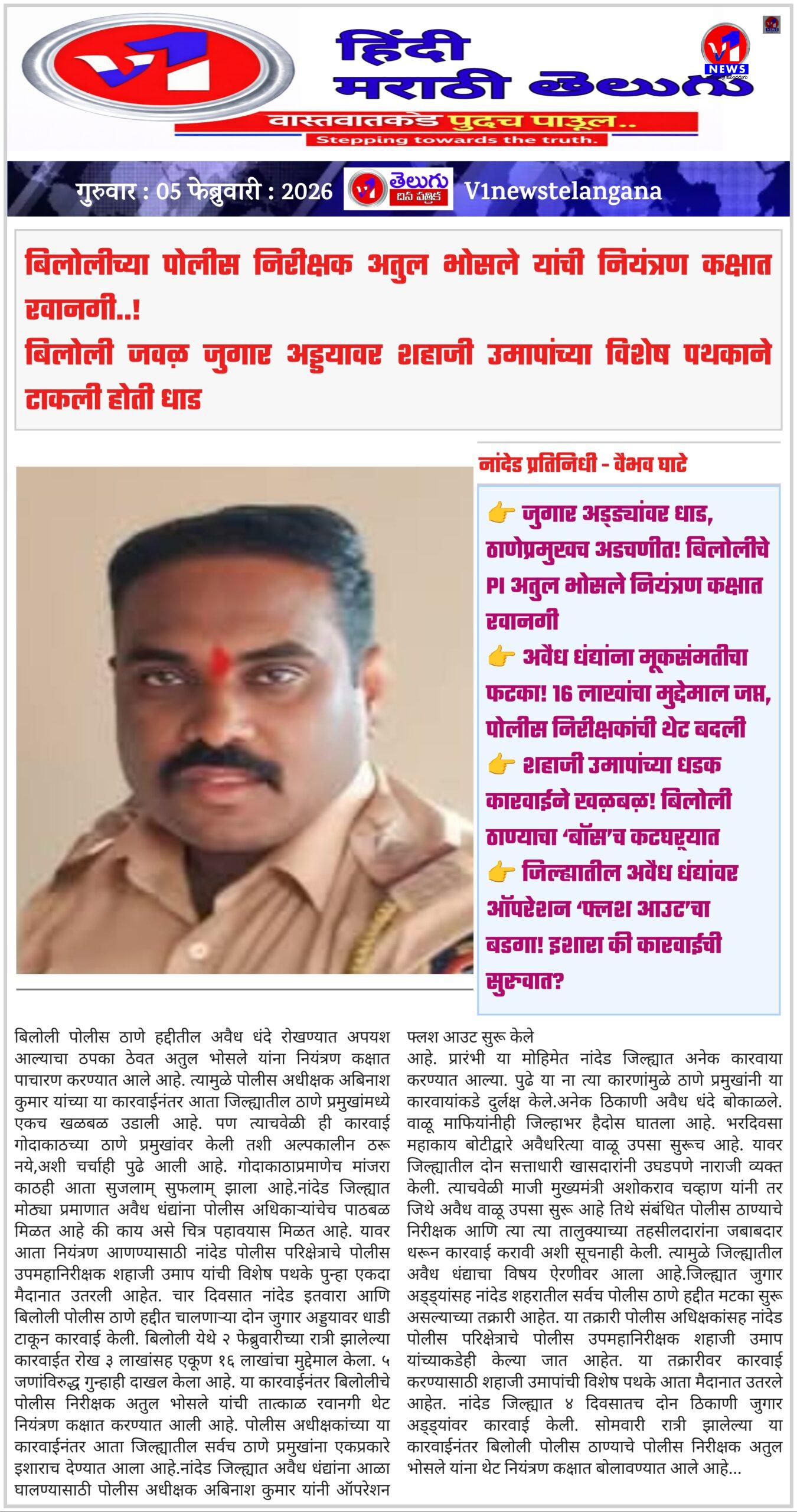 👉जुगार अड्ड्यांवर धाड, ठाणेप्रमुखच अडचणीत! बिलोलीचे PI अतुल भोसले नियंत्रण कक्षात रवानगी 👉 अवैध धंद्यांना मूकसंमतीचा फटका! १६ लाखांचा मुद्देमाल जप्त, पोलीस निरीक्षकांची थेट बदली 👉 शहाजी उमापांच्या धडक कारवाईने खळबळ! बिलोली ठाण्याचा ‘बॉस’च कटघऱ्यात 👉 जिल्ह्यातील अवैध धंद्यांवर ऑपरेशन ‘फ्लश आउट’चा बडगा! इशारा की कारवाईची. रोख ३ लाखांसह एकूण